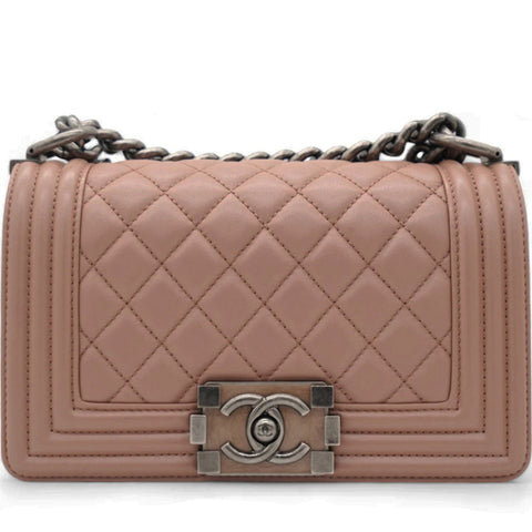 | This stylish Chanel Blush Pink Quilted Boy Bag is made from pastel pink quilted leather. It features a silver-tone CC buckle and a leather and metal chain link strap. The interior is lined with fabric and features a zip pocket. |