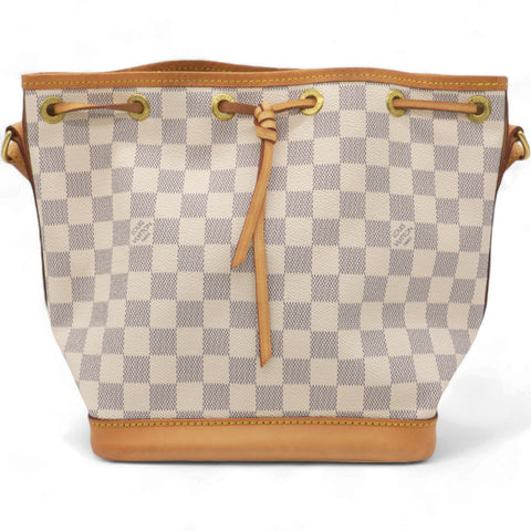 | The bag features vachetta cowhide leather at the base, a pull cinch cord, an adjustable leather shoulder strap, and polished brass hardware including eyelets and links. The pull opens to a beige fabric interior. |