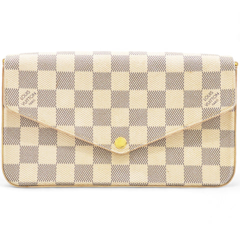 | This stylish wallet is crafted of classic Louis Vuitton Damier white and blue-coated canvas. It features a structured base and an optional polished gold chain link strap. The envelope style front-facing flap opens with a gold snap to a light pink fabric interior with a patch pocket and 2 additional inserts. This is a beautiful versatile shoulder bag that is practical for daily use with the luxury and style, only from Louis Vuitton! |