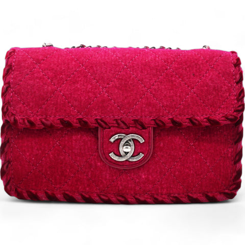 | This unique bag is made out of a dark felt with the iconic diamond shaped stitching and thick velvet stitches on the exterior edge. The hardware is silver tone which includes chain and a CC turn lock. The interior has a dark felt and leather lining.This is a marvelous and unique bag classic, ideal for day or evening wear, from Chanel! |