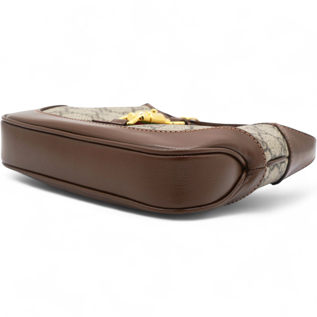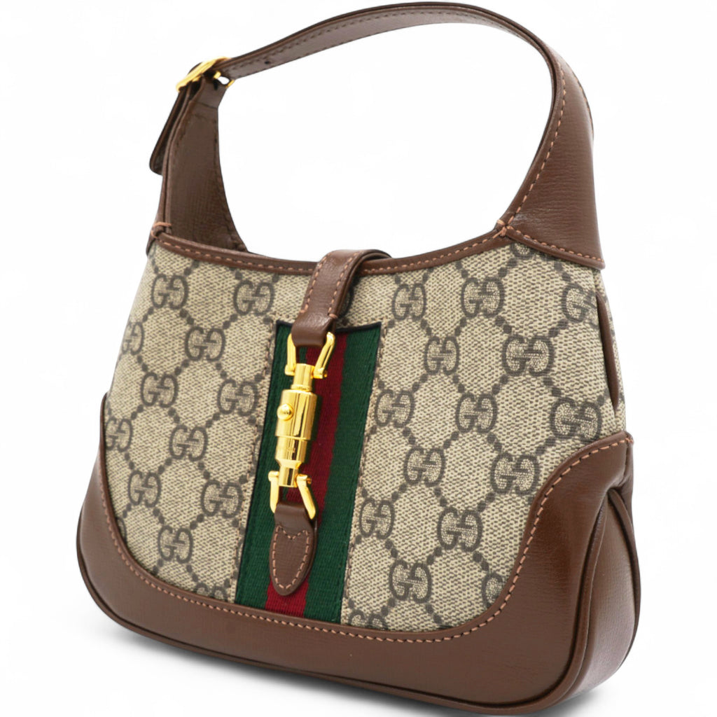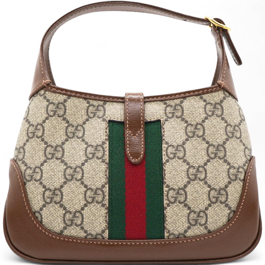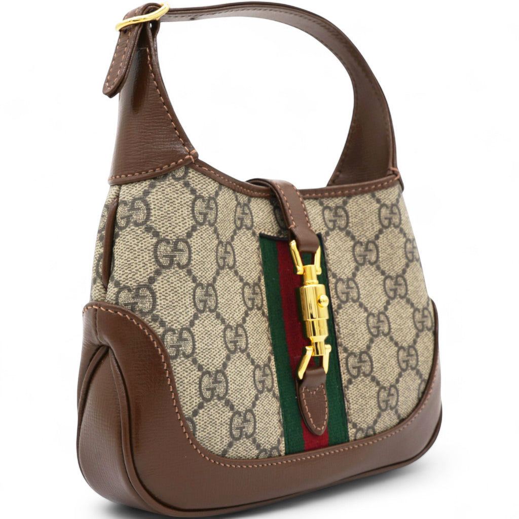| This Gucci hobo is beautifully crafted of traditional brown on beige Gucci GG monogram coated canvas. The bag features a signature red and green web stripe down the center and brown cowhide leather trim including the adjustable looping shoulder strap, base, corners, and the crossover strap. This secures with a gold piston lock and opens to a beige microfiber interior with a patch pocket. |