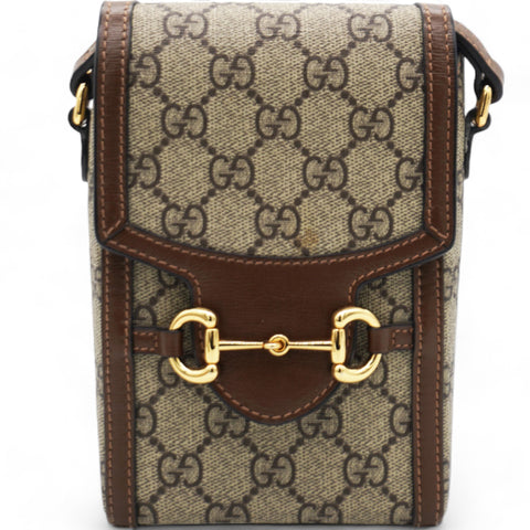 | This shoulder bag is crafted of coated canvas with the Gucci monogram. The bag features brown leather trim, an adjustable looping leather shoulder strap, and a gold horse-bit detail on the front. The flap opens to a beige microfiber interior. |