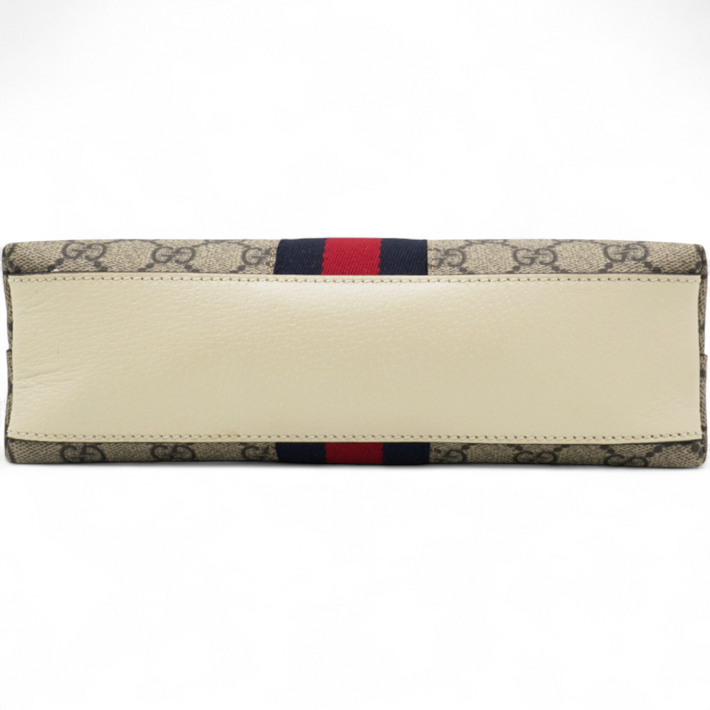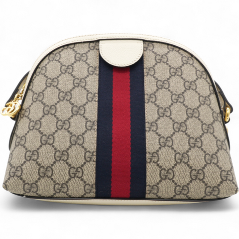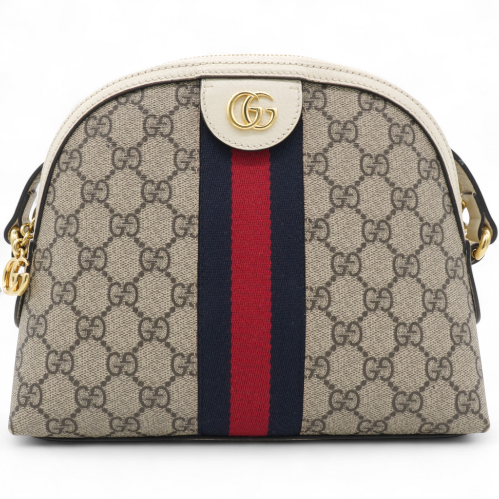| This camera-style crossbody bag is crafted of monogram coated canvas with white leather trim. The bag features a white leather adjustable shoulder strap, a blue and red web stripe on the front, and a gold wrap-around zipper that opens to a beige microfiber interior with pockets. |
