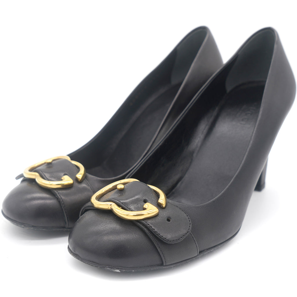 This is a pair of authentic Gucci pumps. Subtle details add a refined feel to this mid-heel pump. Crafted from smooth black leather the style is accentuated with a sculpted block heel. The gold-toned G adds a logo touch.