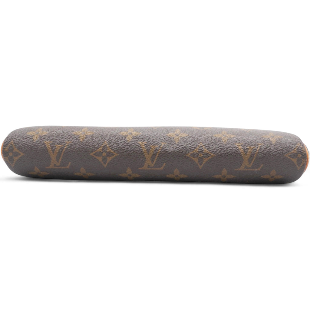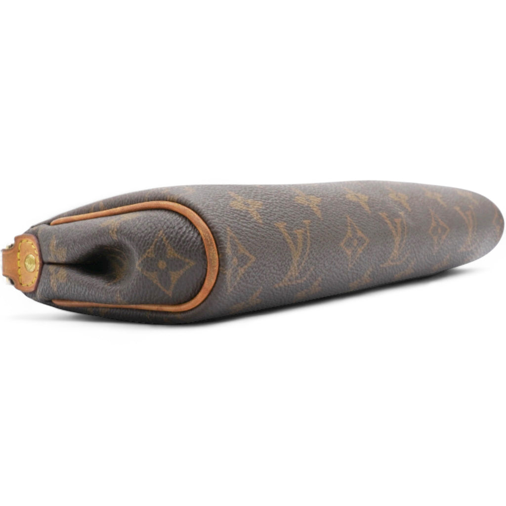| This stylish and versatile bag is crafted of classic Louis Vuitton monogram coated canvas with vachetta leather trim. This clutch features a polished gold-toned chain strap and removable vachetta shoulder strap. The gold top zipper opens to a cocoa brown fabric interior. |