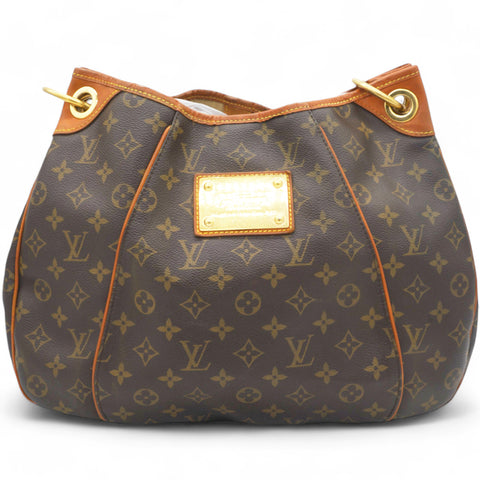 This stylish shoulder bag is finely crafted of classic Louis Vuitton monogram on toile canvas. It features an adjustable vachetta leather shoulder strap, vachetta leather piping and trim complete with polished brass hardware including a large engraved front plate. The top opens to a light beige microfiber interior with a flap pocket and patch pockets.