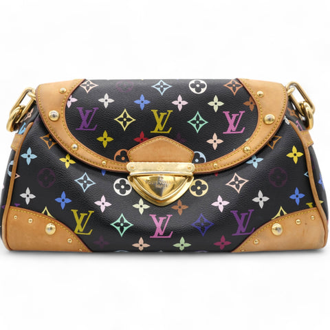 | This stylish tote is crafted of Louis Vuitton multicolore monogram on black toile canvas. The bag has a treatment of vachetta cowhide leather including a looping leather shoulder strap, base corners and trim for the crossover flap as well as polished brass hardware including a frontal brass press lock. This opens to a sable microfiber interior. This is a marvelous tote, ideal for day or evening, from Louis Vuitton! |