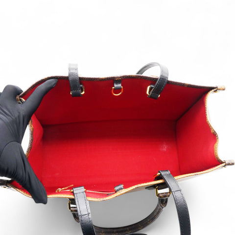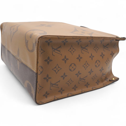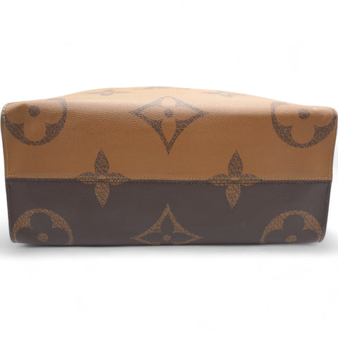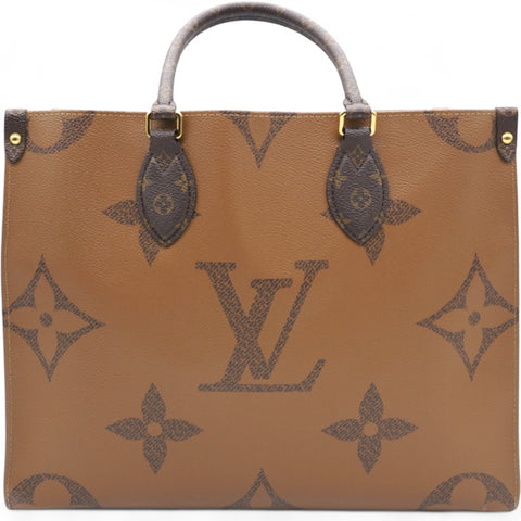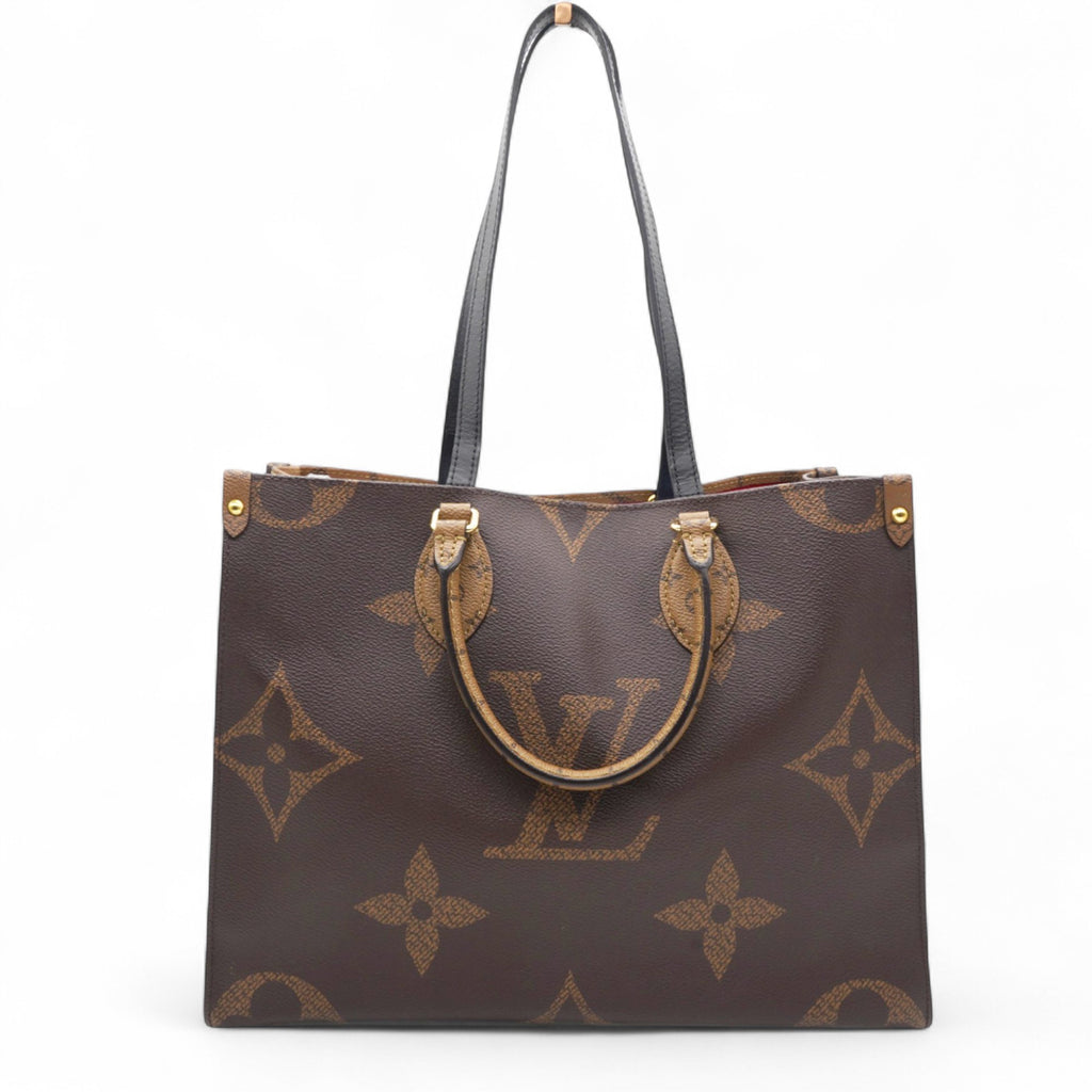 This limited edition tote features oversized and smaller versions of the classic Louis Vuitton monogram printed in brown on coated canvas . The bag features rolled top handles and long shoulder straps that can be tucked away inside the bag, accented with polished brass hardware. The top is open to a spacious red fabric interior with zipper and patch pockets.