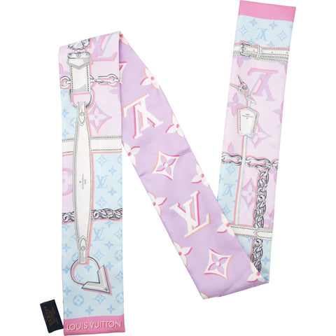 This very chic 100% silk scarf features an attractive design of the Louis Vuitton monogram printed with classic vachetta straps and chains. This is an excellent scarf with a one of a kind look from Louis Vuitton!
