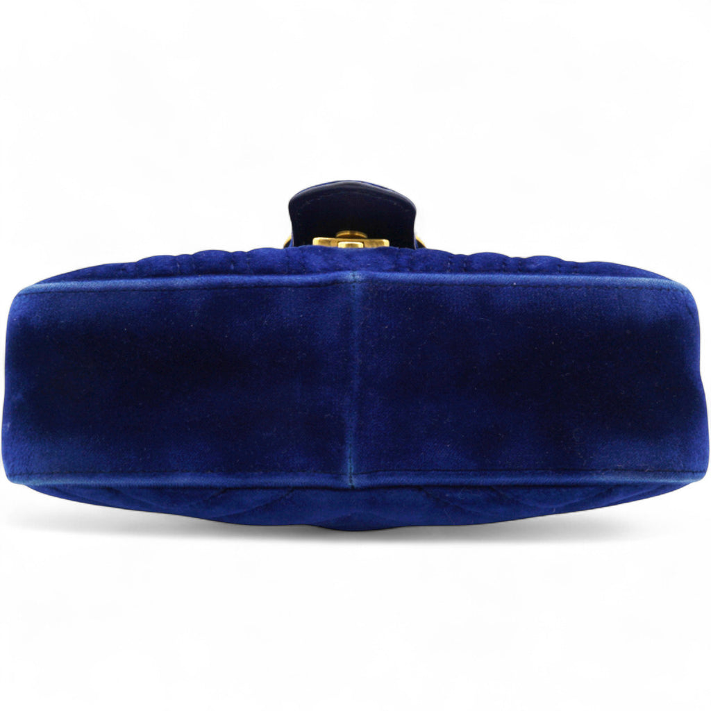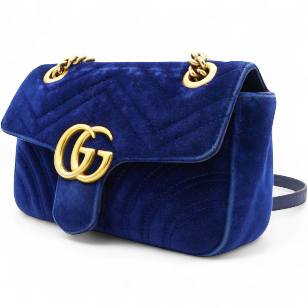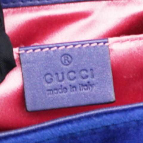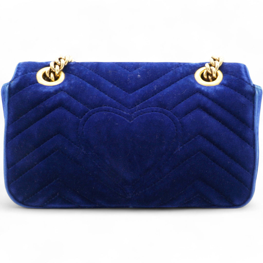 | This lovely bag is crafted of chevron-quilted soft velvet in blue. It features an aged gold chain shoulder strap with a leather shoulder pad and an aged gold Gucci GG logo closure. The front flap opens to a red satin interior with a zipper pocket. |