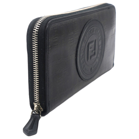 | Crafted from glaze embossed FF Logo calfskin and features round FF logo on the front. The zip wallet opens up to black fabric interior with open compartments, a zip compartment and credit card compartments. |