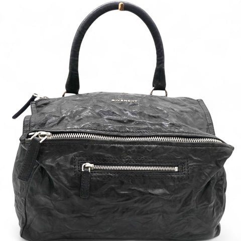 This unique messenger bag is finely crafted of soft distressed sheepskin leather in black. This bag features a strap handle, a front zipper pocket, and gold hardware. The top zippers open to a black fabric interior with zipper and patch pockets.