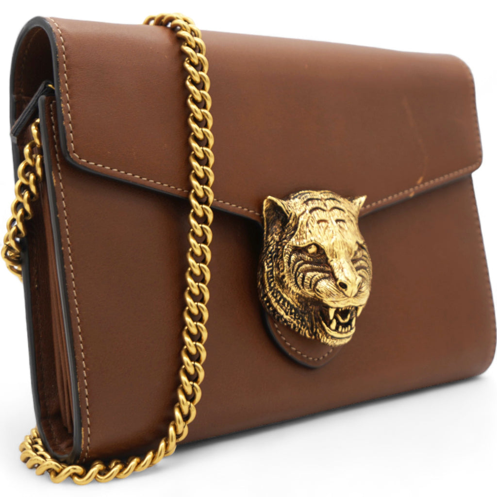 | This stylish bag is crafted of smooth calfskin leather in brown. This bag features a removable gold chain shoulder strap and a stunning gold lion head closure. This opens to a brown leather and black fabric interior with card slots, zipper and patched pockets for a sophisticated look for everyday essentials from Gucci! |