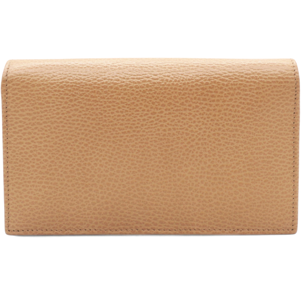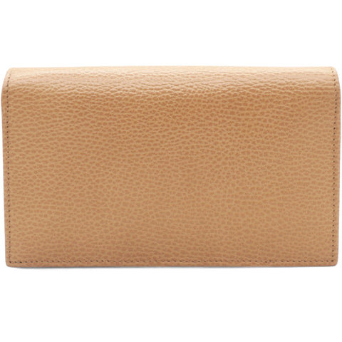 | This stylish clutch wallet is crafted of textured calfskin leather in beige. It features a front flap with a polished light gold interlocking GG Gucci logo and an optional gold chain cross-body shoulder strap. The flap opens to a compact beige leather and dark brown fabric interior with card slots and a zipper compartment. |