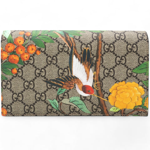 | This chic chain wallet is crafted of GG monogram canvas. This bag features a gold shoulder chain and a floral pattern overlay detailing. The flap opens to a red matte leather interior with a zipper currency compartment, card slots, and patch pockets. This is a beautiful clutch wallet for day or evening, from Gucci! |