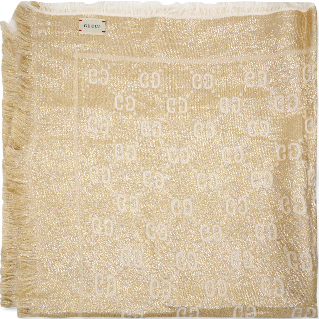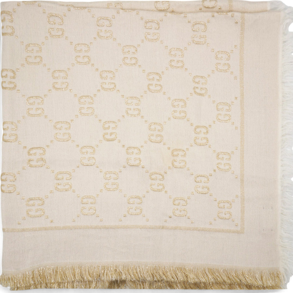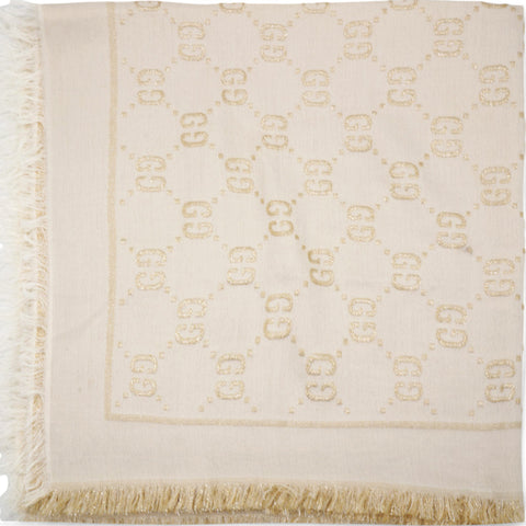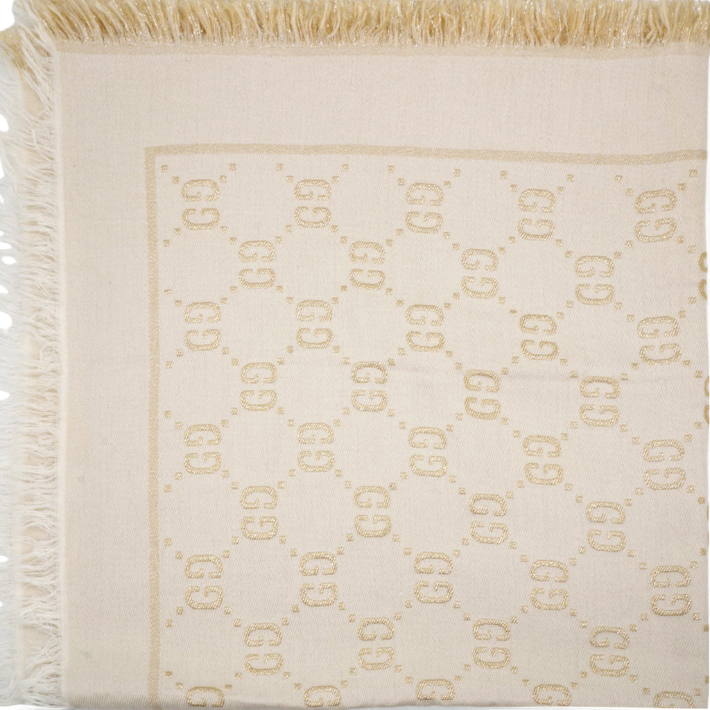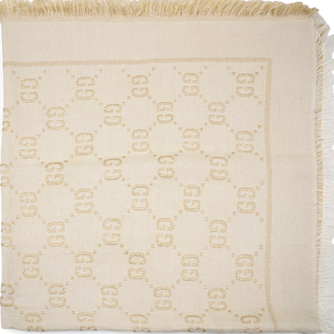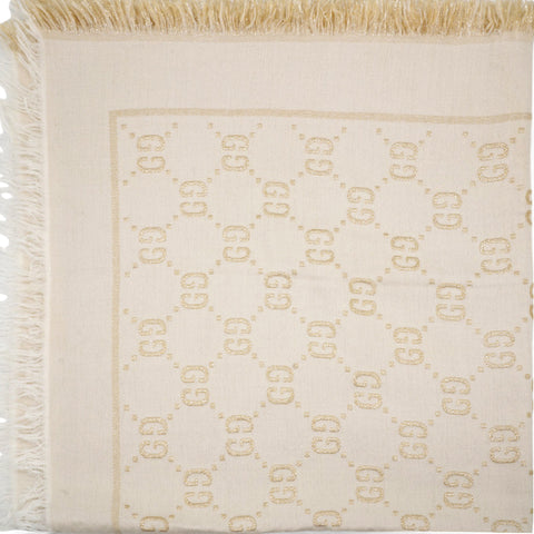 | The initials of the Founder of the House, Guccio Gucci, alternate across a selection of silk and soft accessories. This white wool shawl is decorated with a sparkling laminated GG motif, while a fringed trim completes the piece. |
