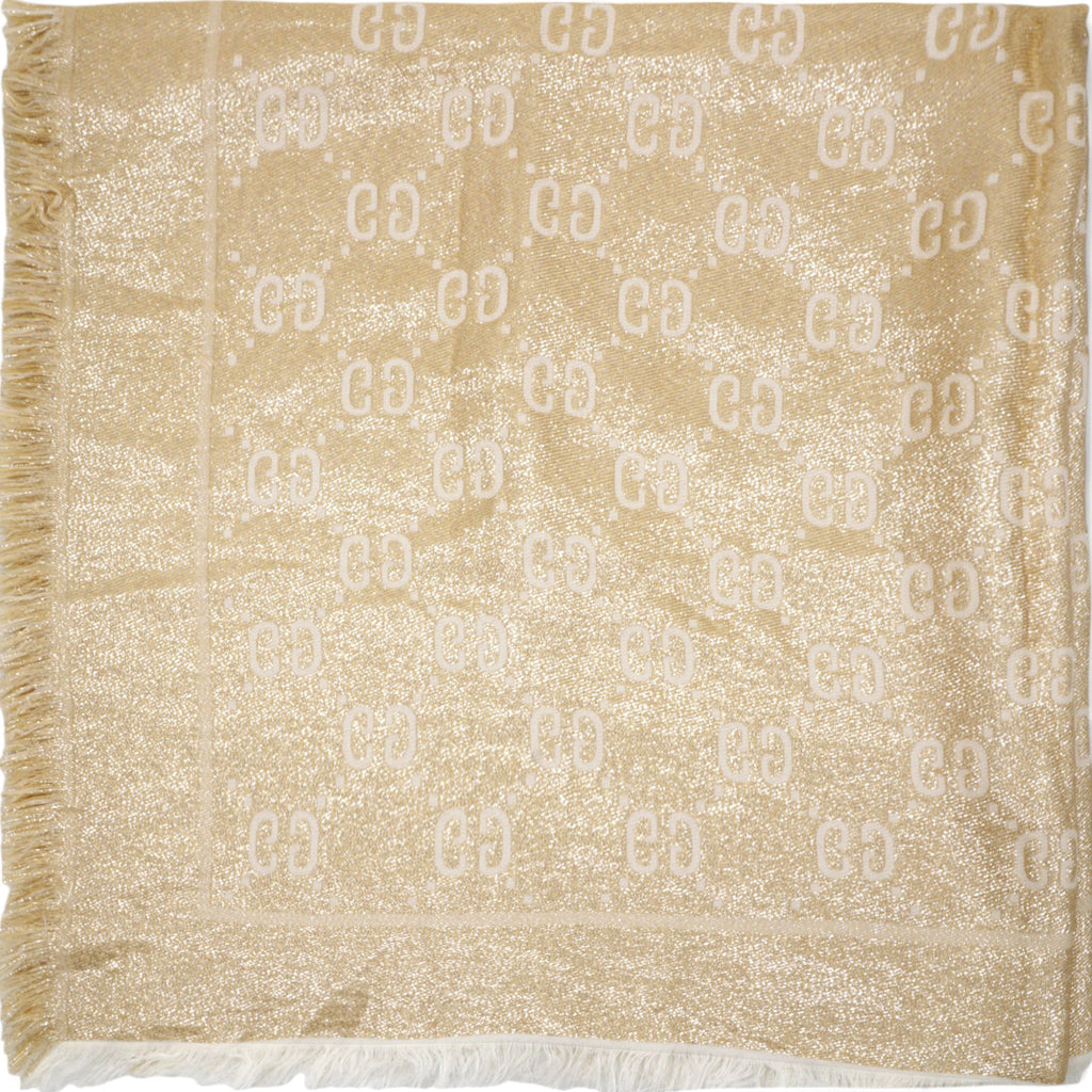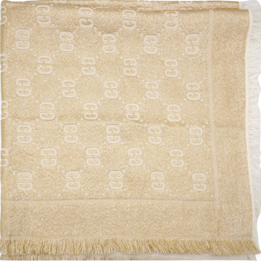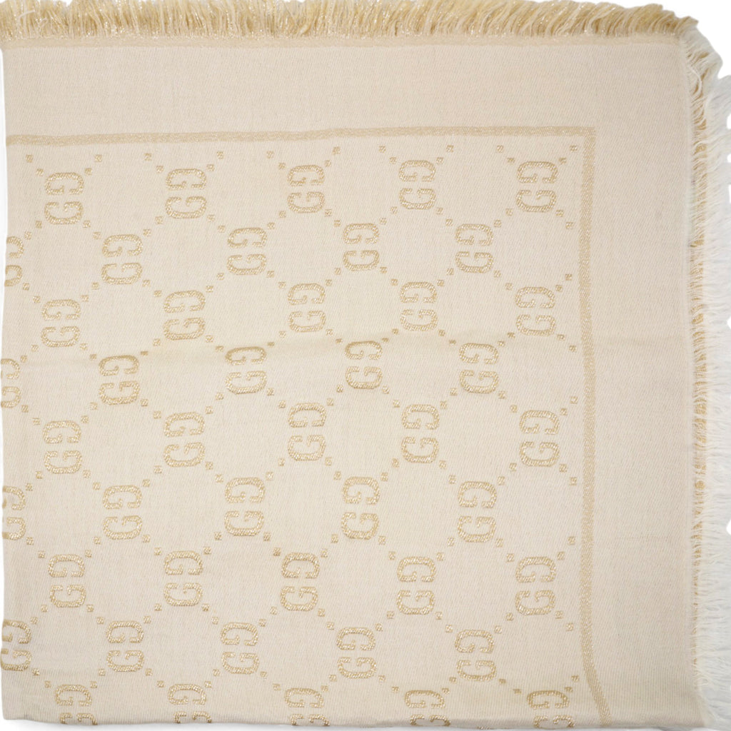 | The initials of the Founder of the House, Guccio Gucci, alternate across a selection of silk and soft accessories. This white wool shawl is decorated with a sparkling laminated GG motif, while a fringed trim completes the piece. |