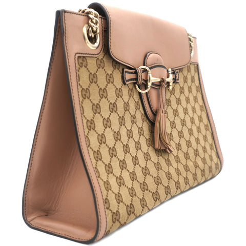 | This chic shoulder bag is crafted of fine Gucci GG monogram brown on beige canvas. The bag features a looping light gold chain link and leather shoulder padded strap, and polished pink leather trim at the base, sides and the top flap. This secures with a frontal attractive horsebit embellishment in light gold and opens to a spacious natural fiber interior with zipper and patch pockets. This is suitable for all of your day or evening necessities with the distinctive style of Gucci! |