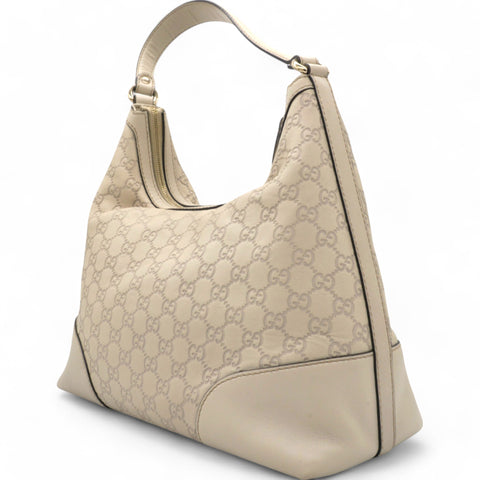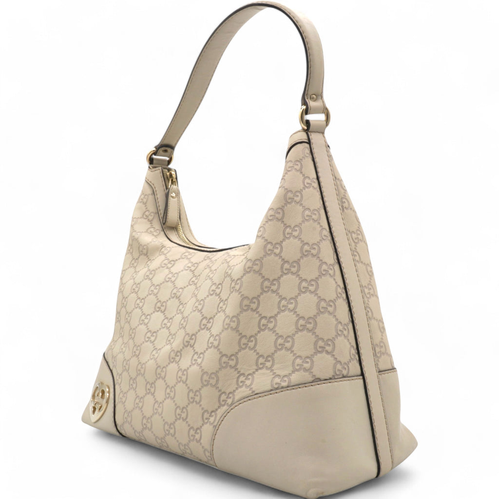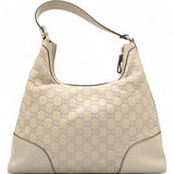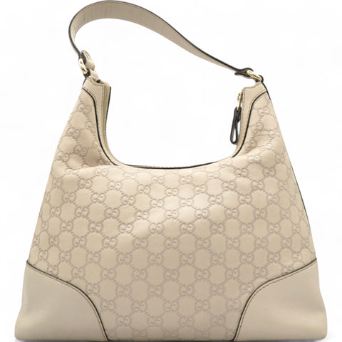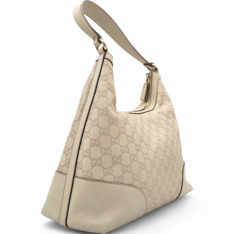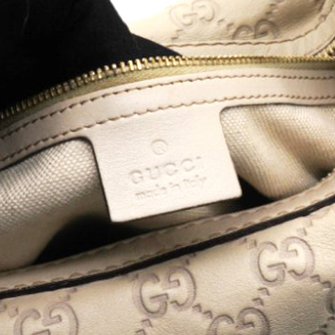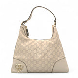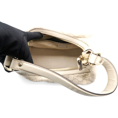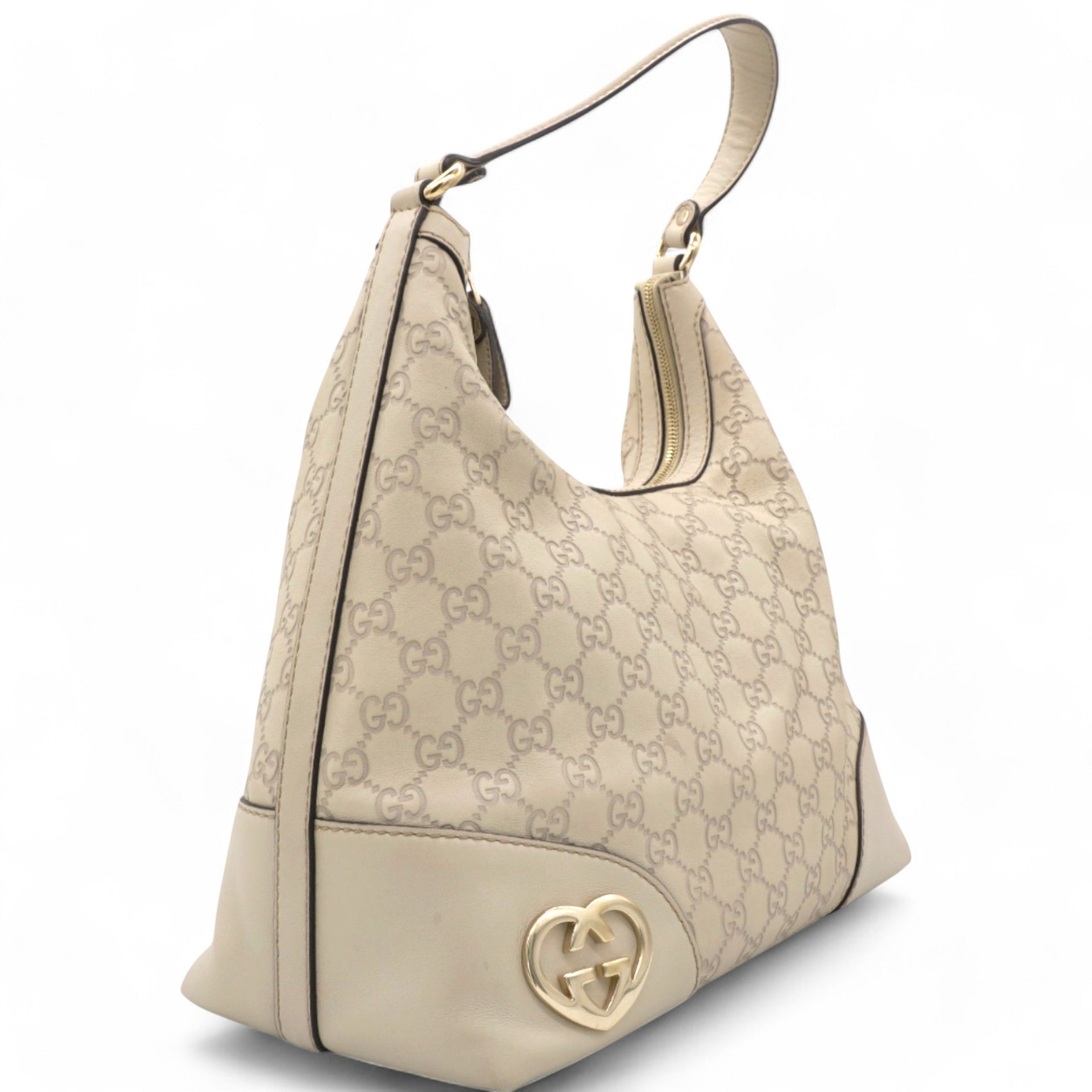 | Off-white is a truly understated hue flaunted all over this Gucci hobo. It has been crafted in leather and adorned with the signature Guccissima print all over. The heart shaped GG logo in gold-tone looks strikingly beautiful while exuding a signature finish. The bottom comes protected with studs. It has a single leather top handle. A top zipper closure opens to a roomy fabric-lined interior with pockets. |