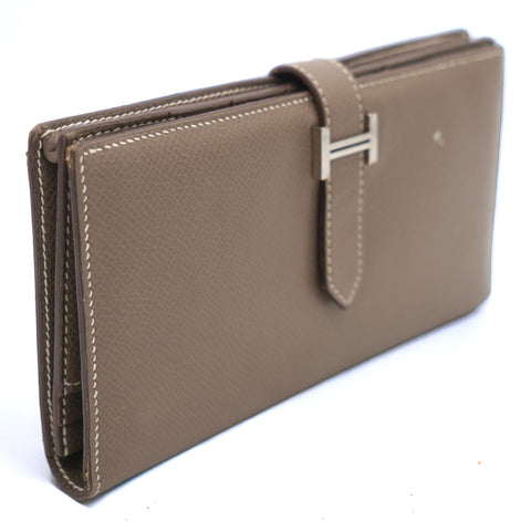 | This authentic Hermes Bearn Wallet Long is your perfect small accessory. Crafted from epsom Etoupe leather featuring its silver-plated 'H' tab closure and silver-tone hardware accents. Its matching Etoupe leather-lined interior showcases multiple card slots, patch and zip pockets perfect for storing bills, coins and cards. A timeless investment piece for any fashionista. |