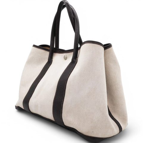 | This stylish and useful tote is crafted of light beige toile canvas and brown leather. The tote features rolled leather top handles, expandable sides, and polished palladium snap closures. |