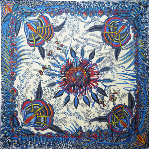 | The Blue scarf inspired by The strange, South African protea flower has become a national symbol, flourishing at the heart of the fynbos, a mountainous, coastal ecosystem of exceptional biodiversity, benefiting from the Mediterranean climate of the Western Cape. |
