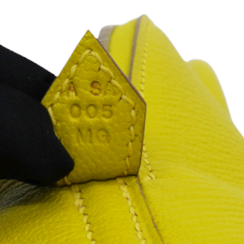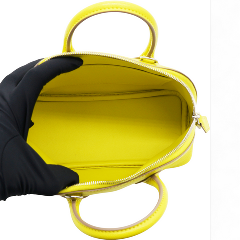 | This Mini 1923 Bolide is of Lime chevre leather with palladium hardware and has tonal stitching, a top zipper closure, double rolled handles, and removable shoulder strap.The interior is lined with lime chevre leather. |