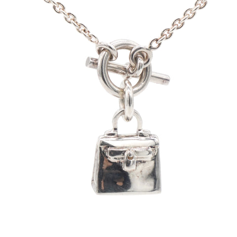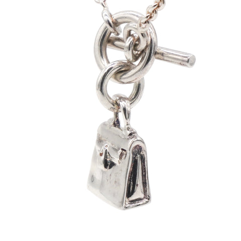 | Introducing the Hermes Amulet 925 Silver Kelly Pendant Necklace, a delicate and subtle piece that captures the essence of Hermes' iconic design. This beautiful necklace features a sterling silver chain with a toggle closure, offering a secure and stylish fastening. The centerpiece of the necklace is a miniature Kelly handbag pendant, an unmistakable symbol of Hermes' timeless elegance and craftsmanship. |