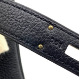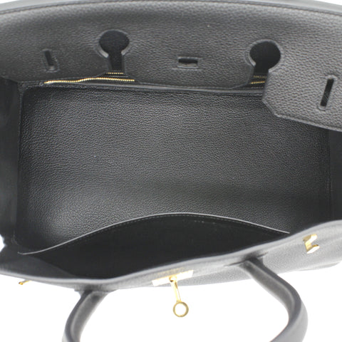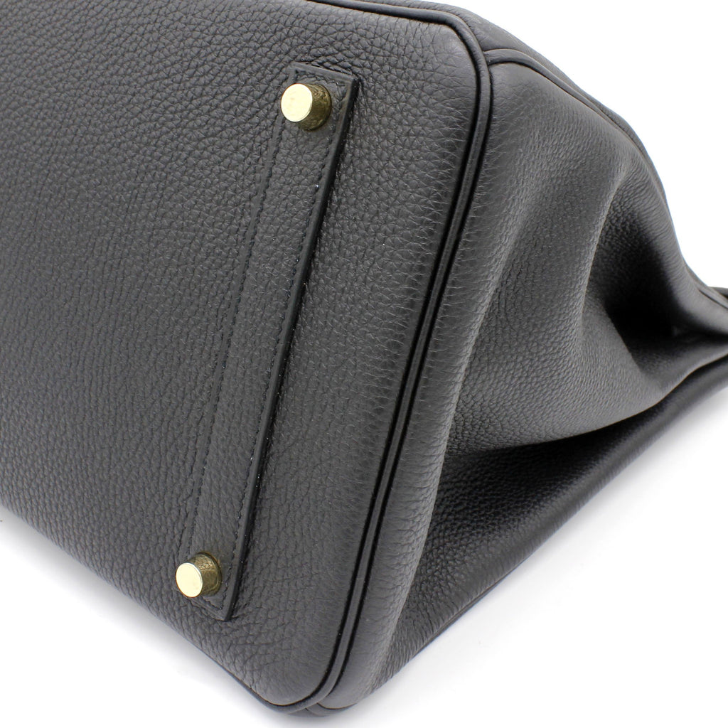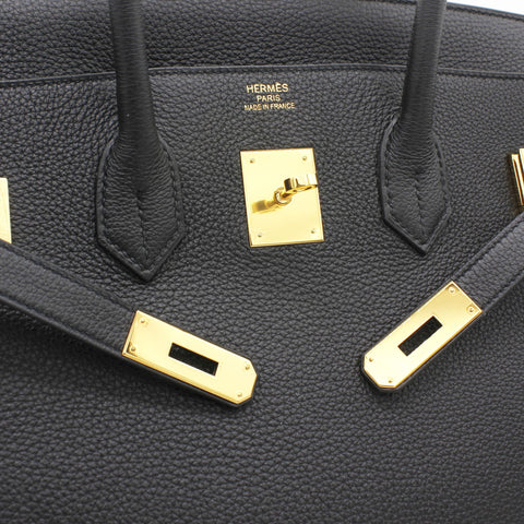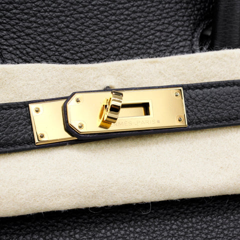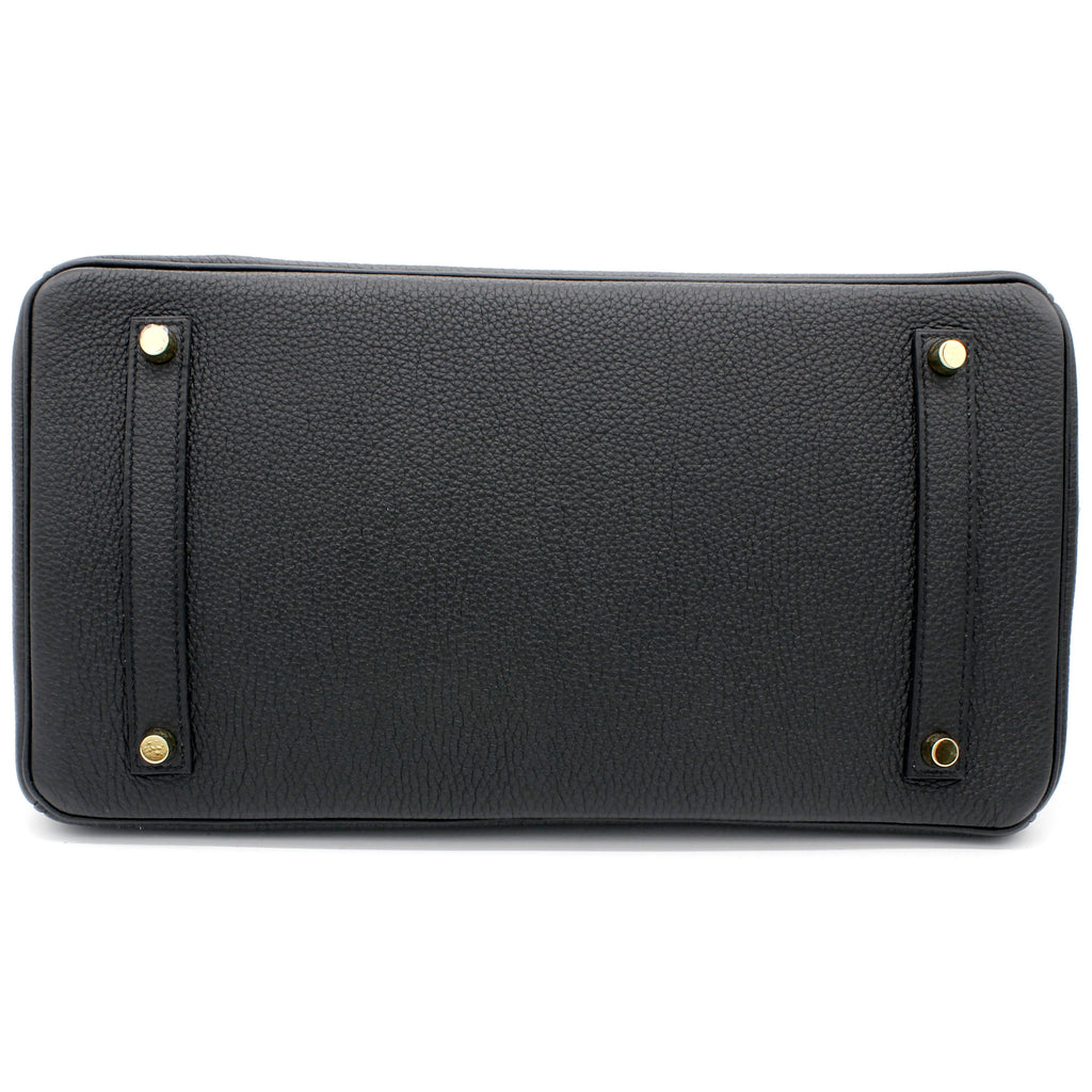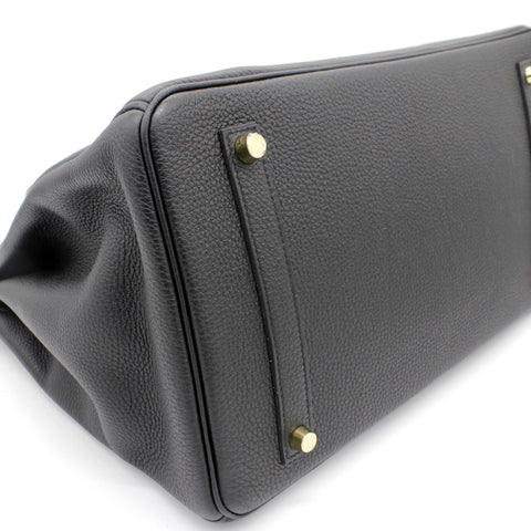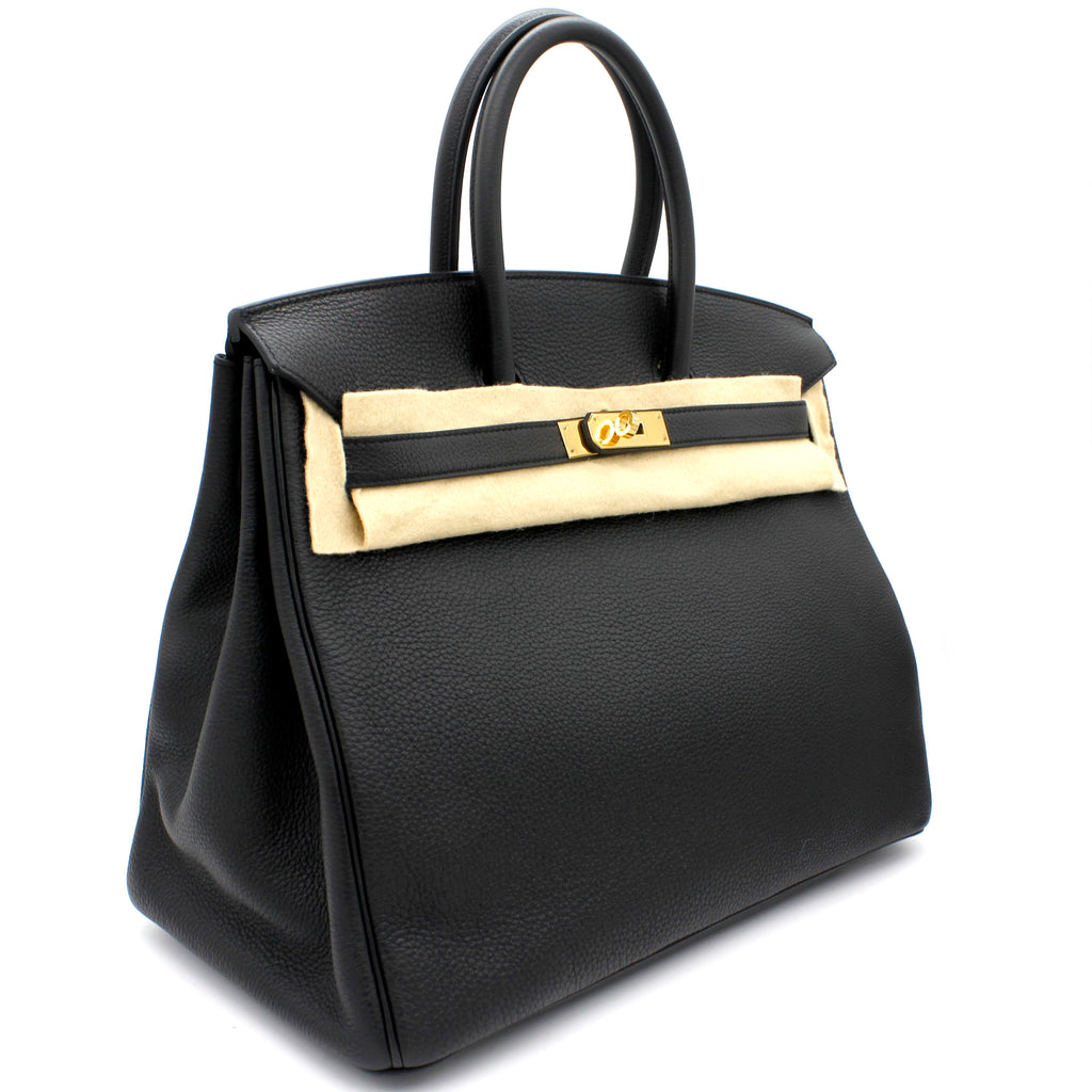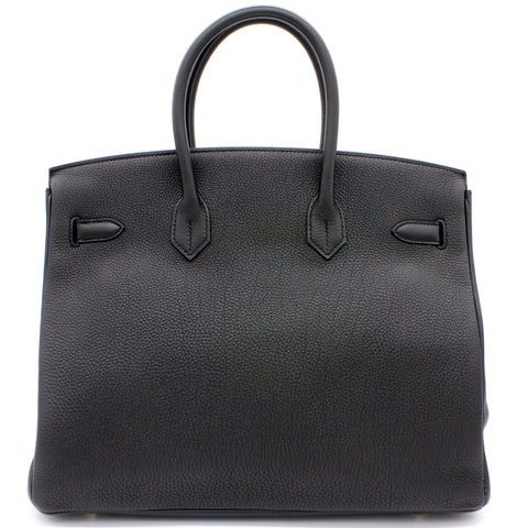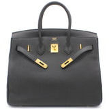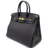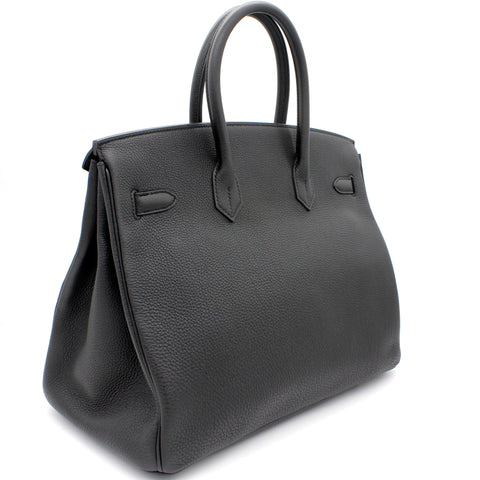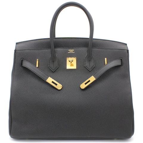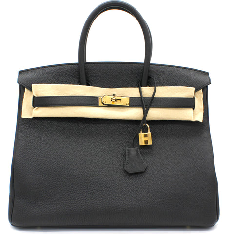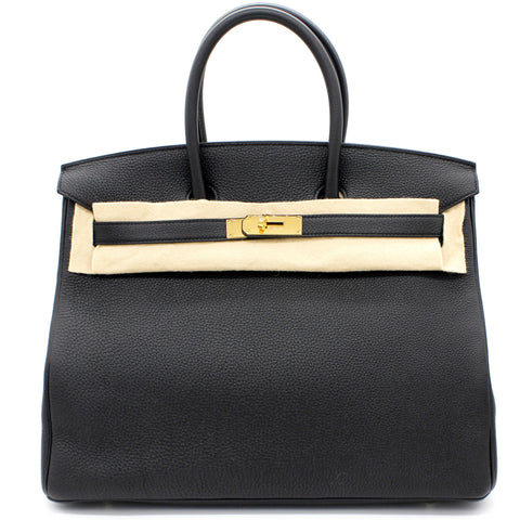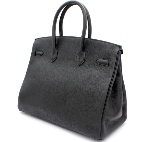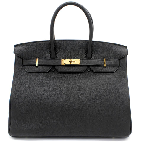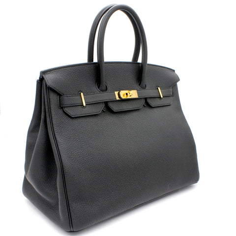| Designed with the actress Jane Birkin in mind, the Birkin bag is a contemporary development from the Kelly bag. Created based on Jane’s suggestions, it was architected to be larger, in order to fit the fast-paced life of the modern women, with several minor yet outstanding adaptations, such as the elongated top handles. Meticulously made in France, this black leather Birkin 35 bag features round top handles, a foldover top with twist-lock closure, hanging padlock detail, a main internal compartment, gold-tone hardware, purse feet and a hanging leather tag. |