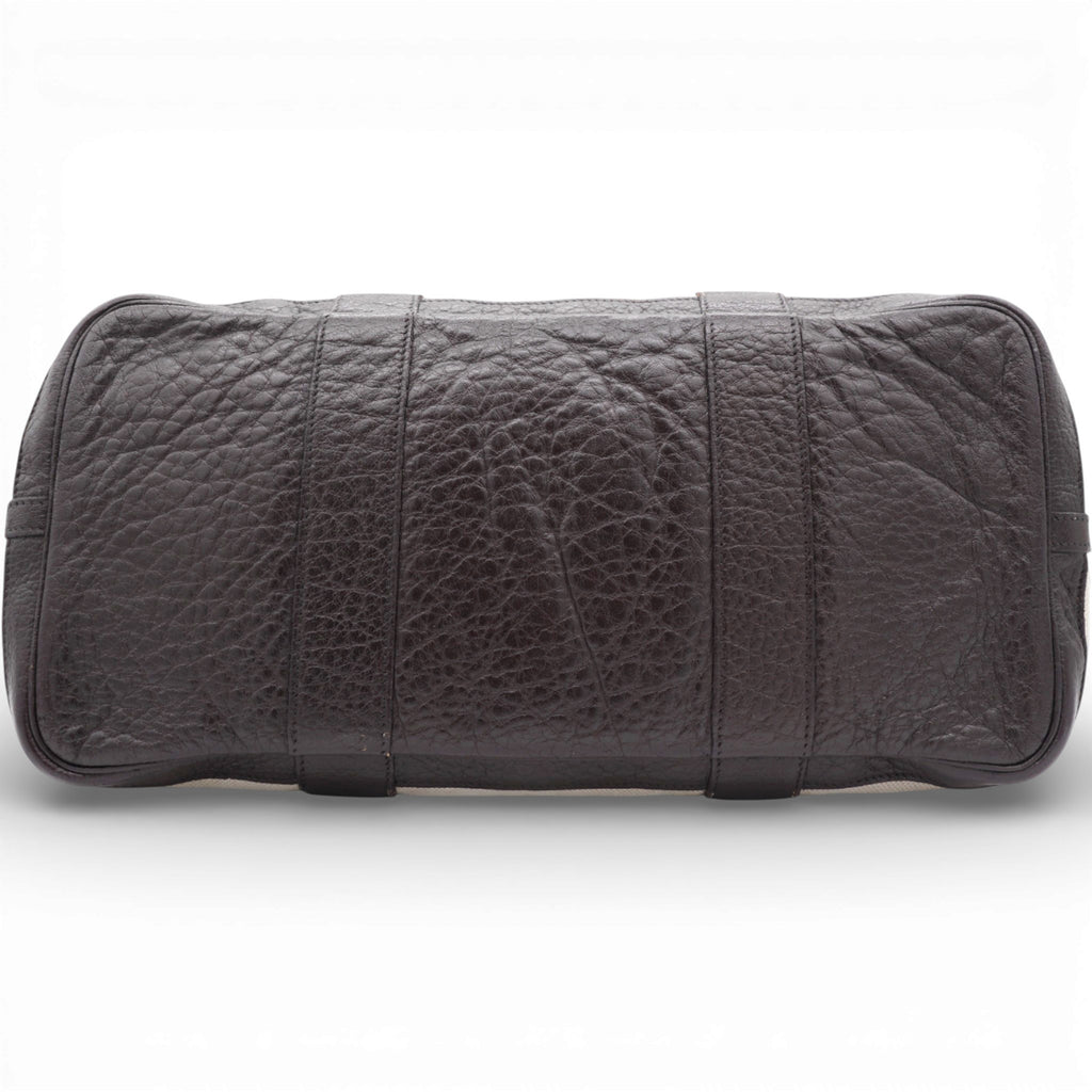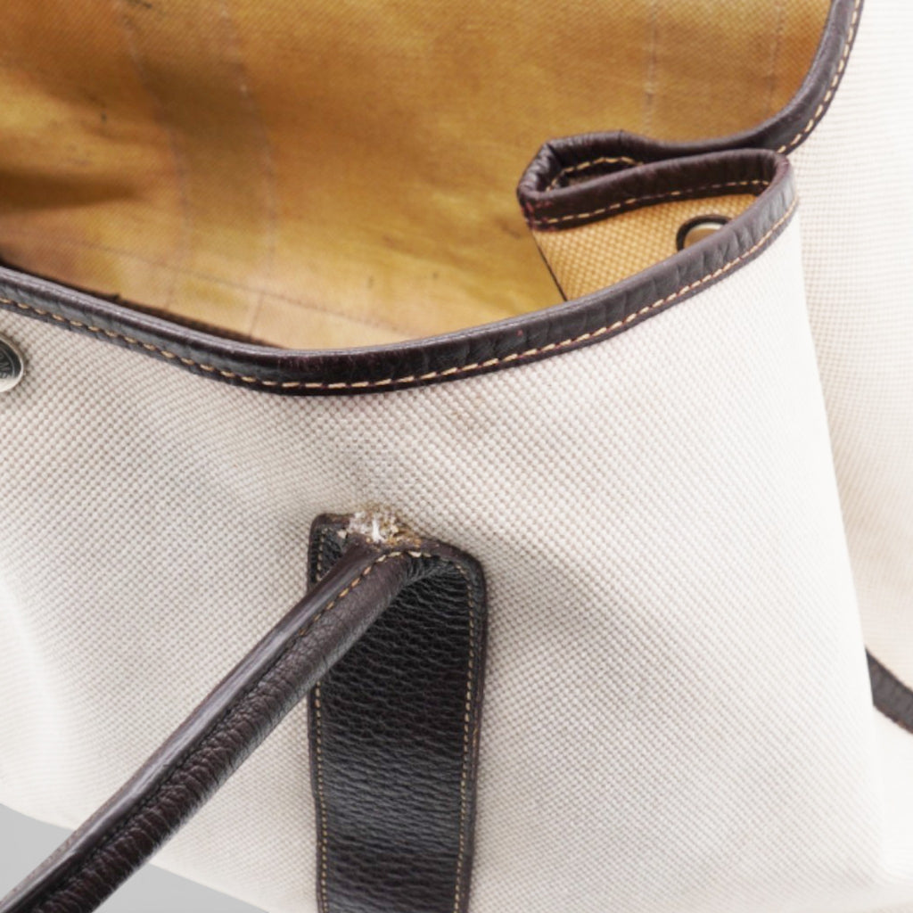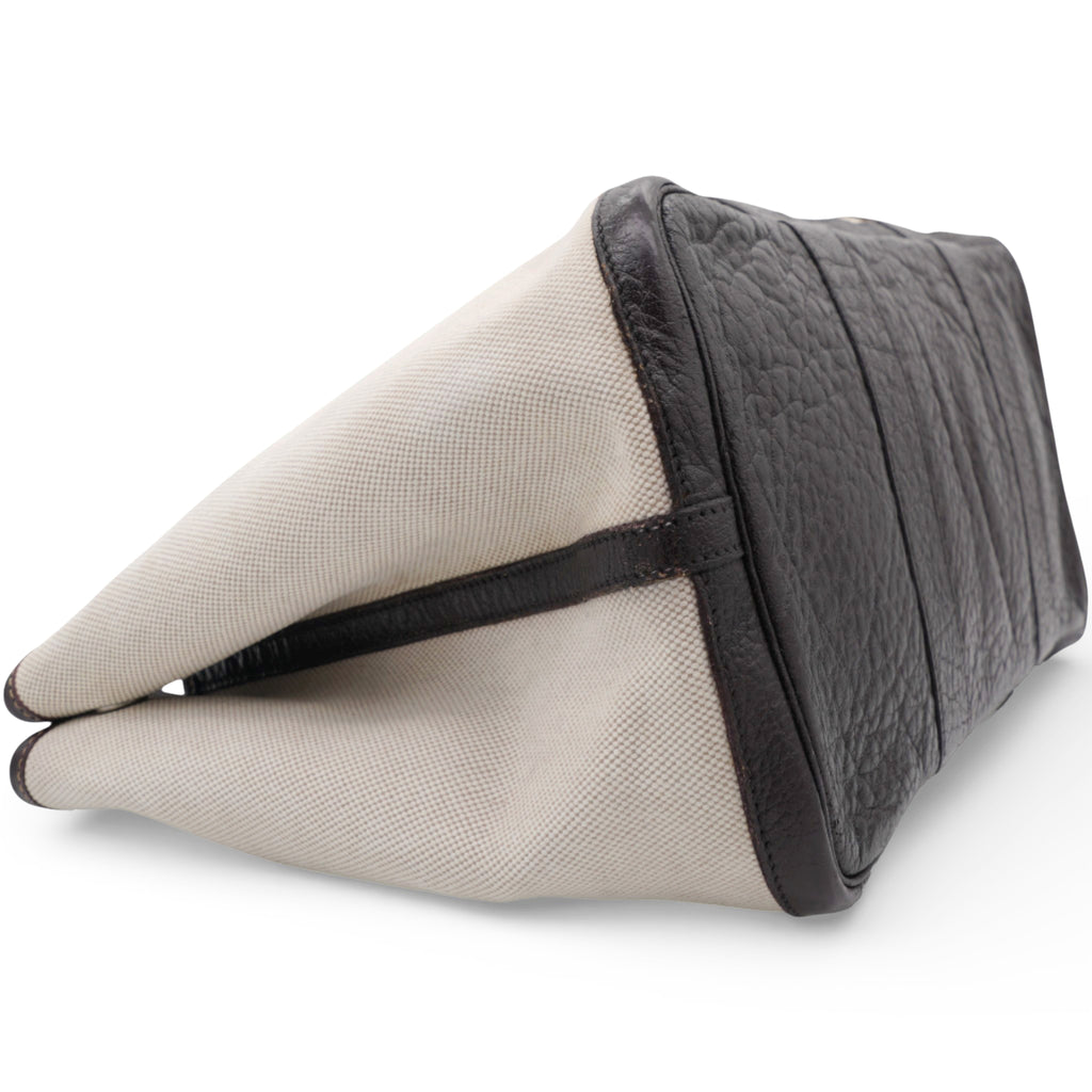 | This stylish and useful tote is crafted of light beige toile canvas and brown leather. The tote features rolled leather top handles, expandable sides, and polished palladium snap closures. |