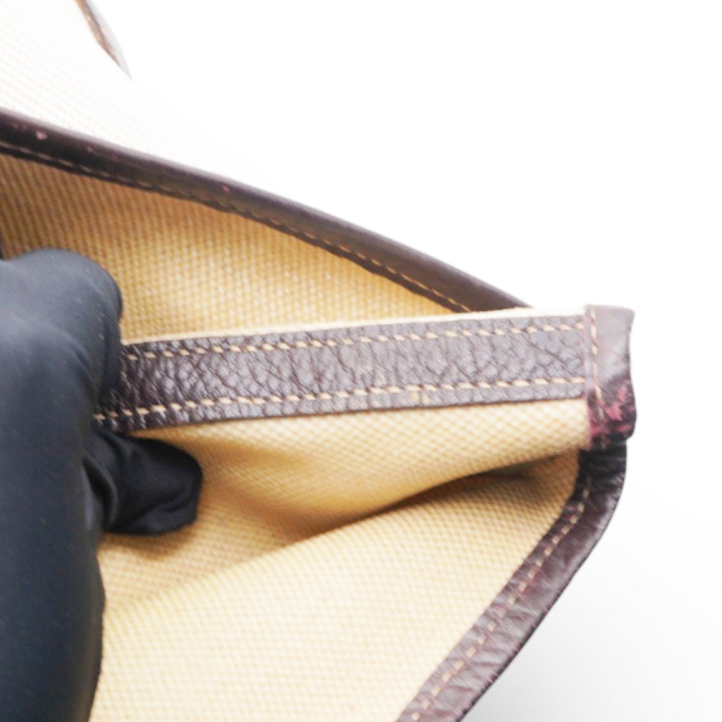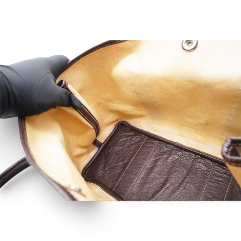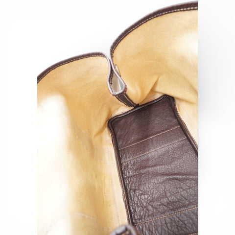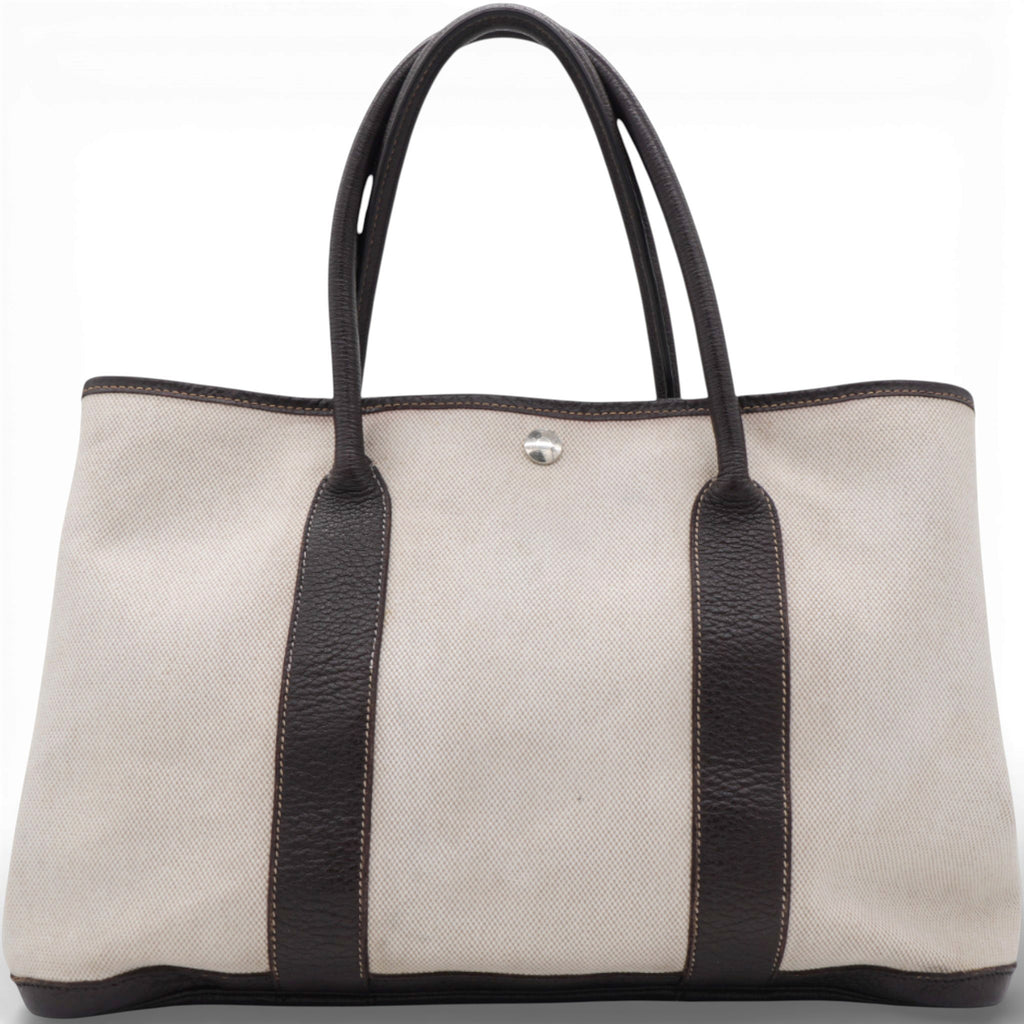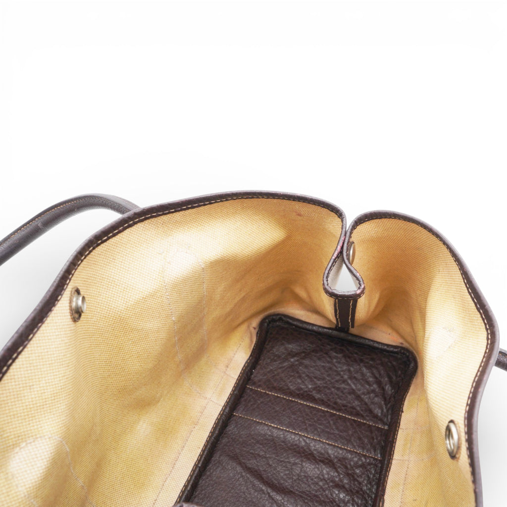 | This stylish and useful tote is crafted of light beige toile canvas and brown leather. The tote features rolled leather top handles, expandable sides, and polished palladium snap closures. |