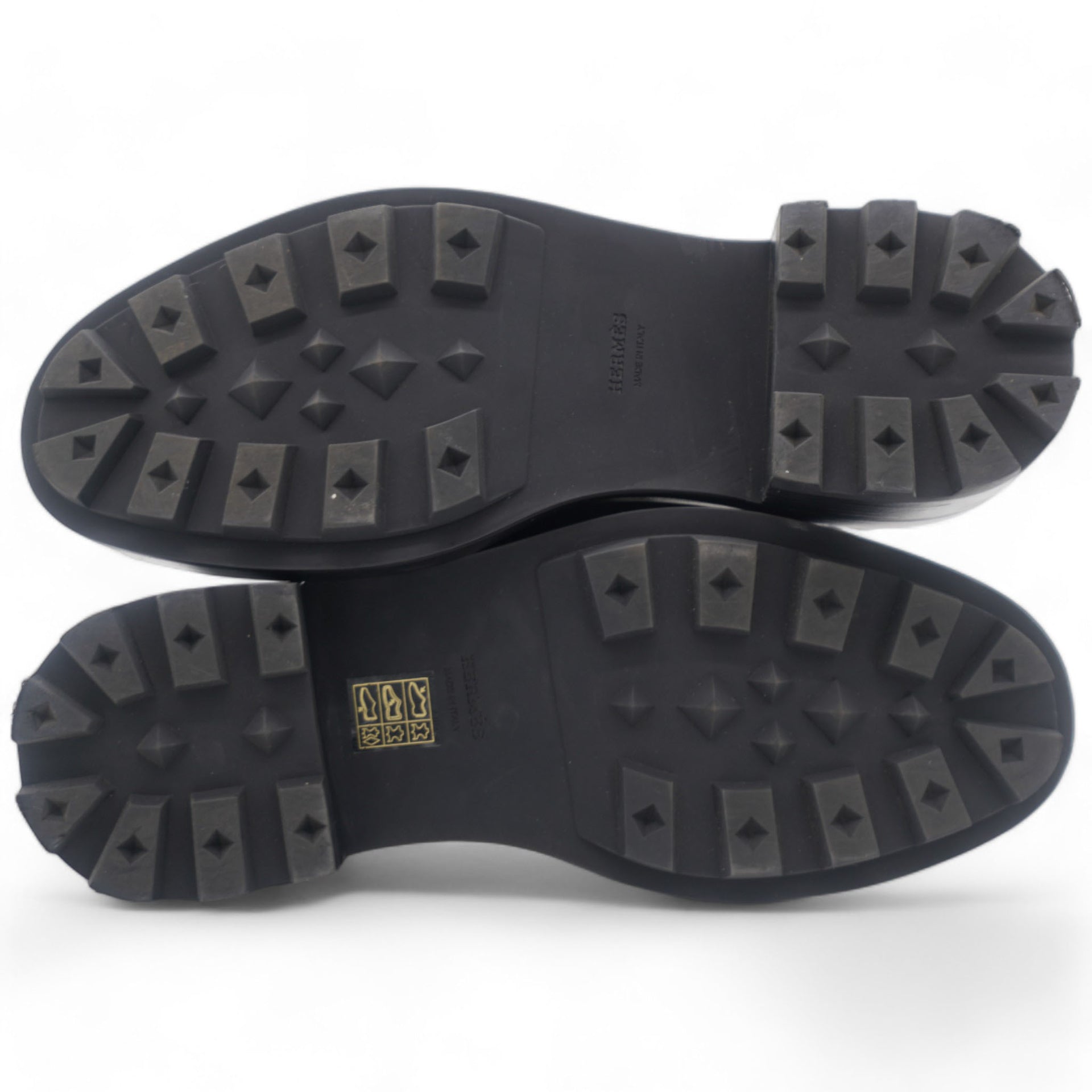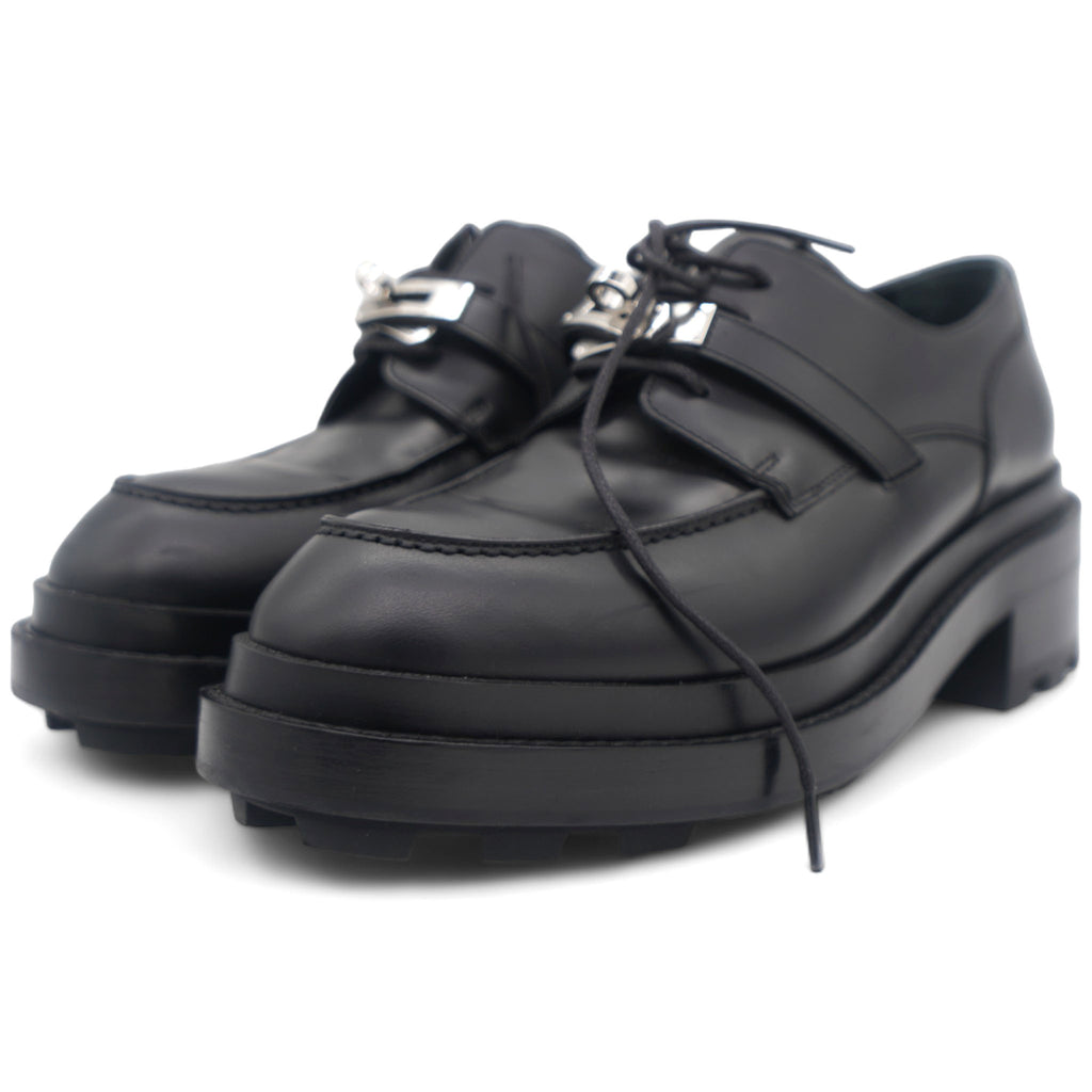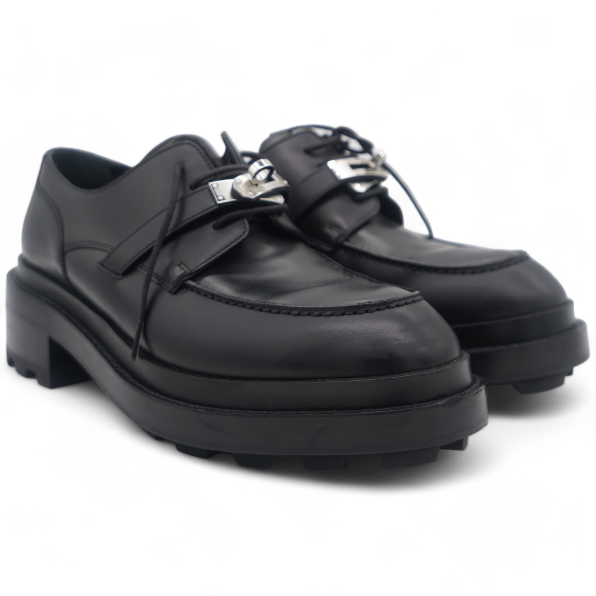 These shoes are crafted of fine black calfskin leather and feature a strap closure that secures with a palladium signature Kelly style turn lock, a stacked heel, and rugged black rubber soles.