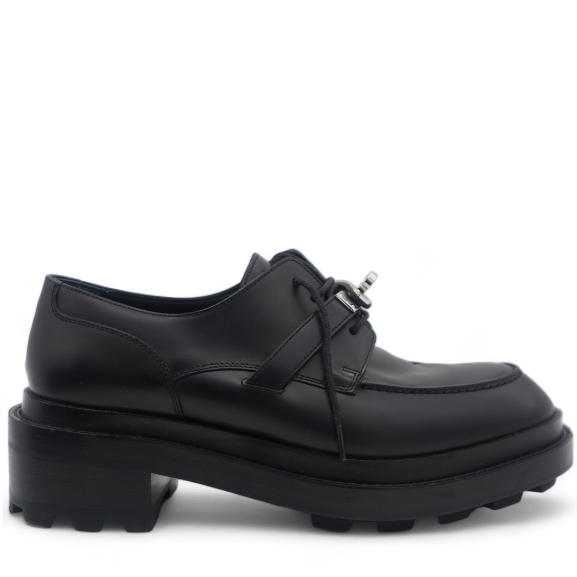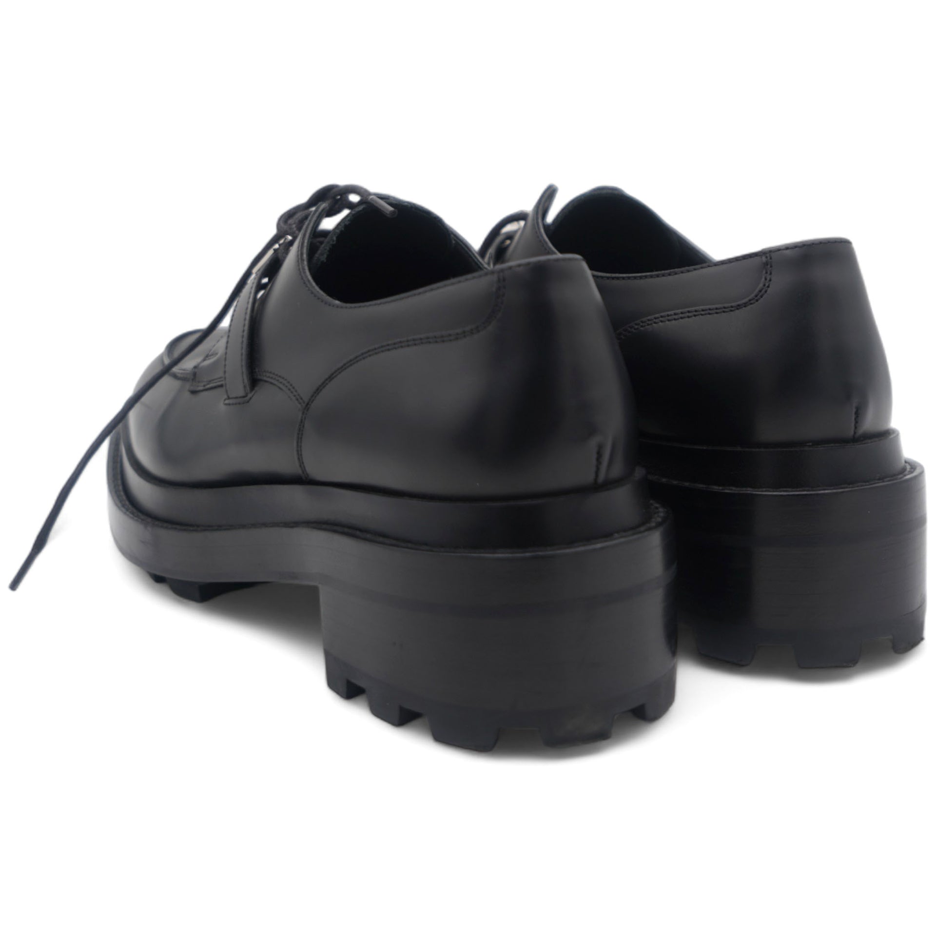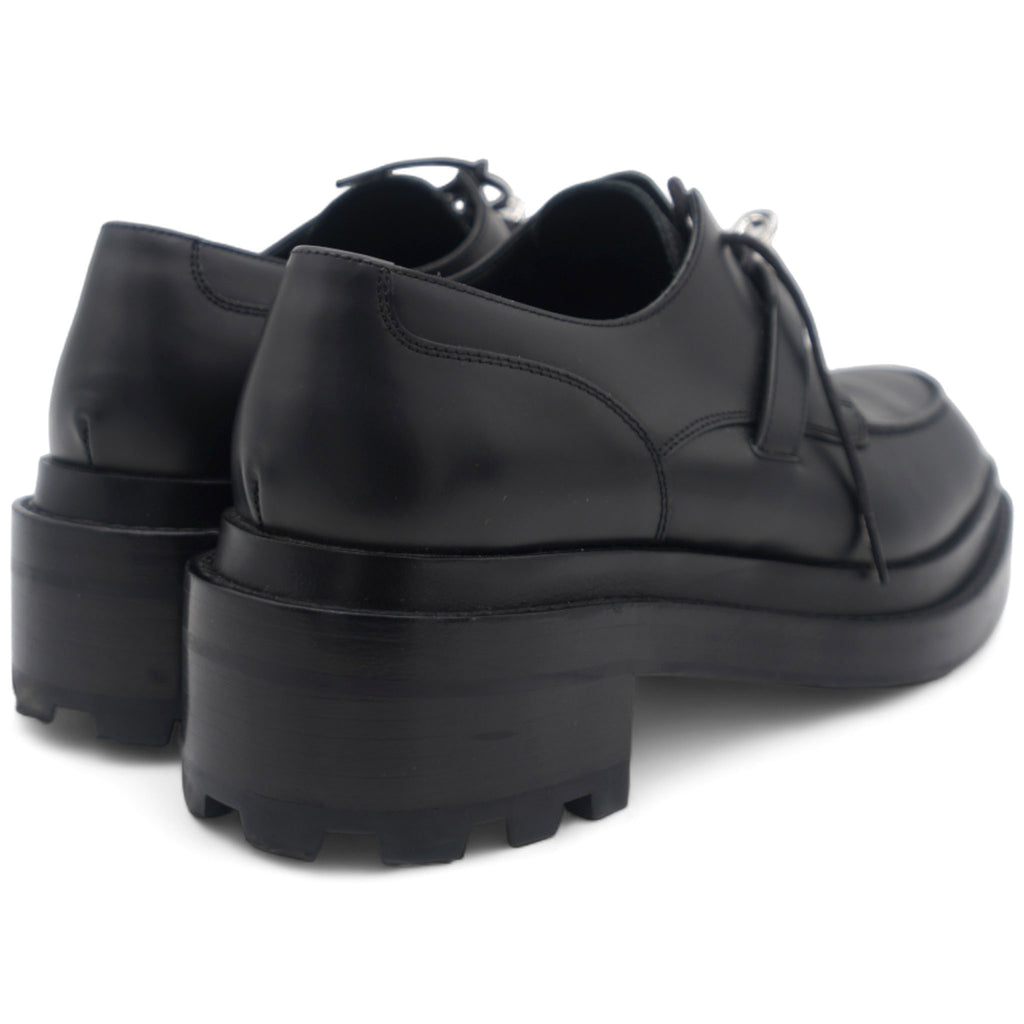 These shoes are crafted of fine black calfskin leather and feature a strap closure that secures with a palladium signature Kelly style turn lock, a stacked heel, and rugged black rubber soles.
