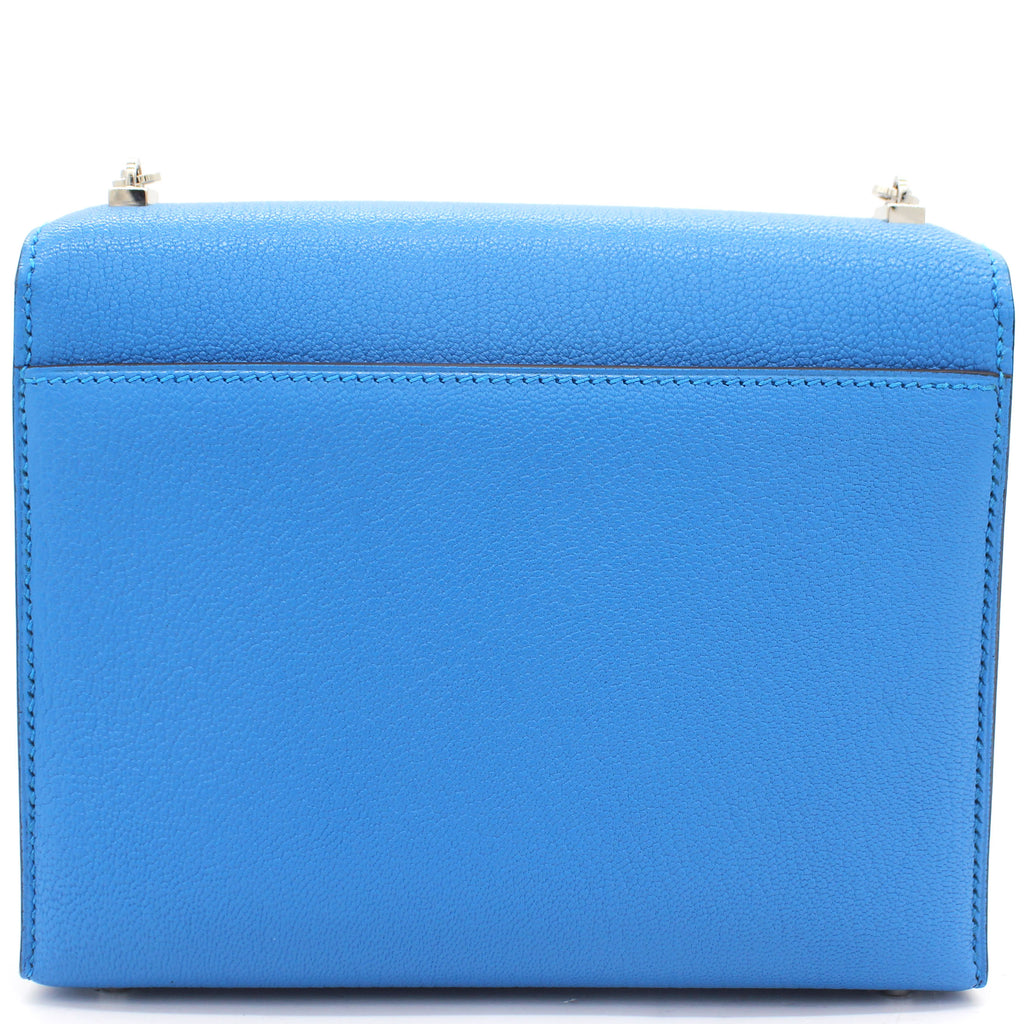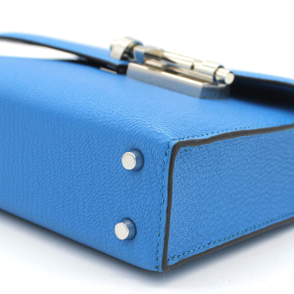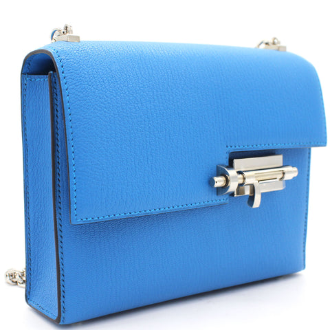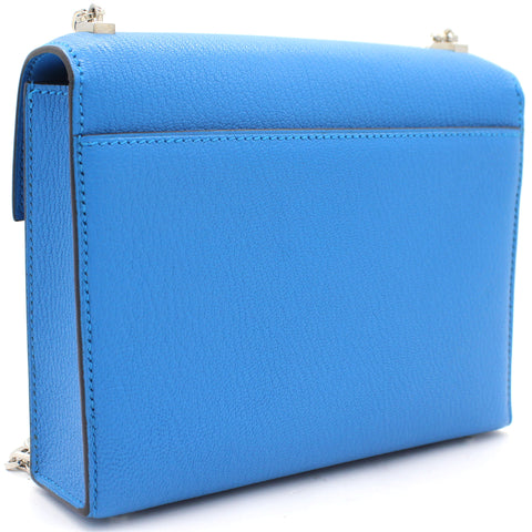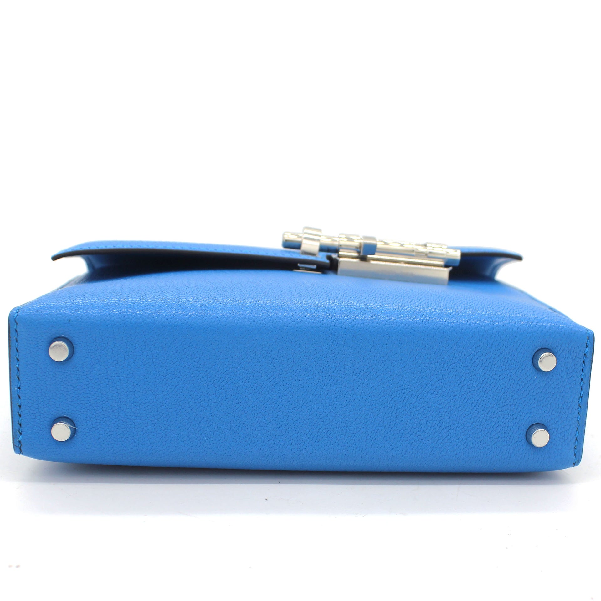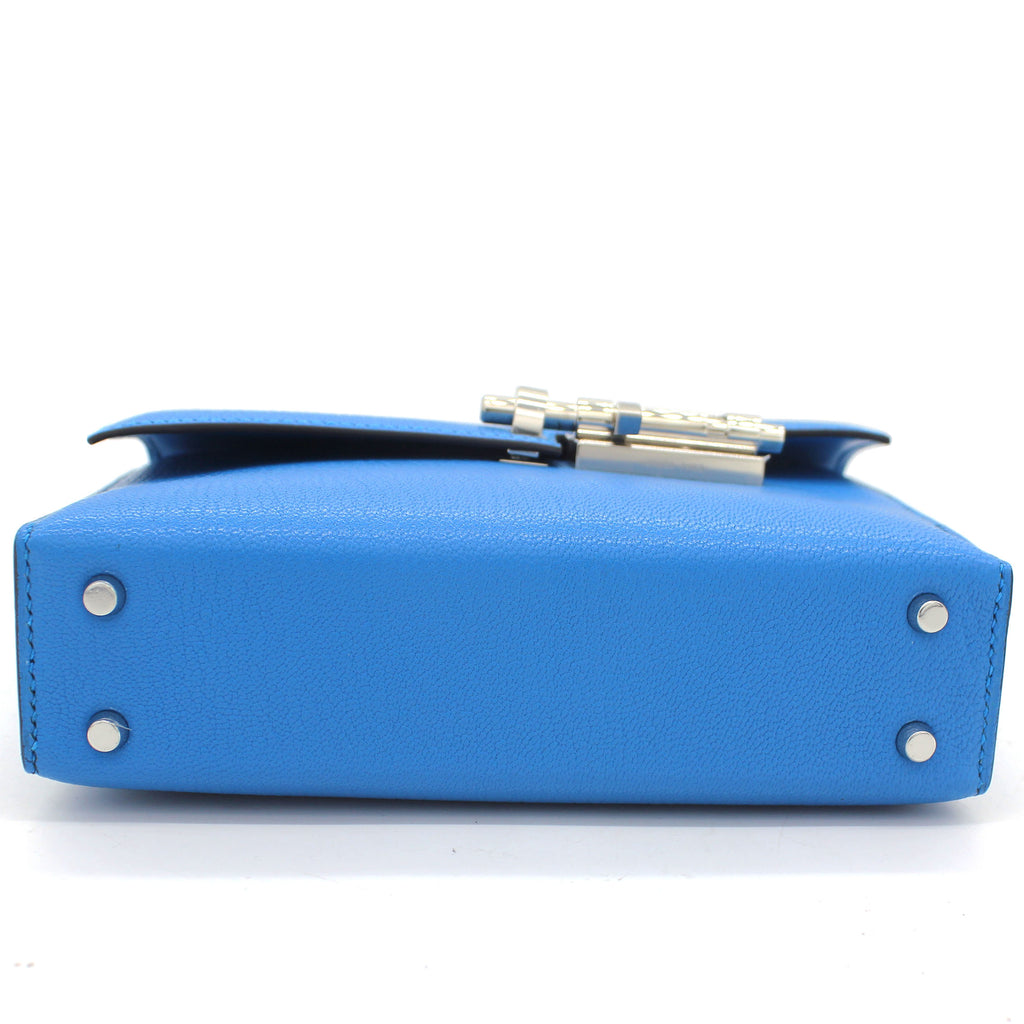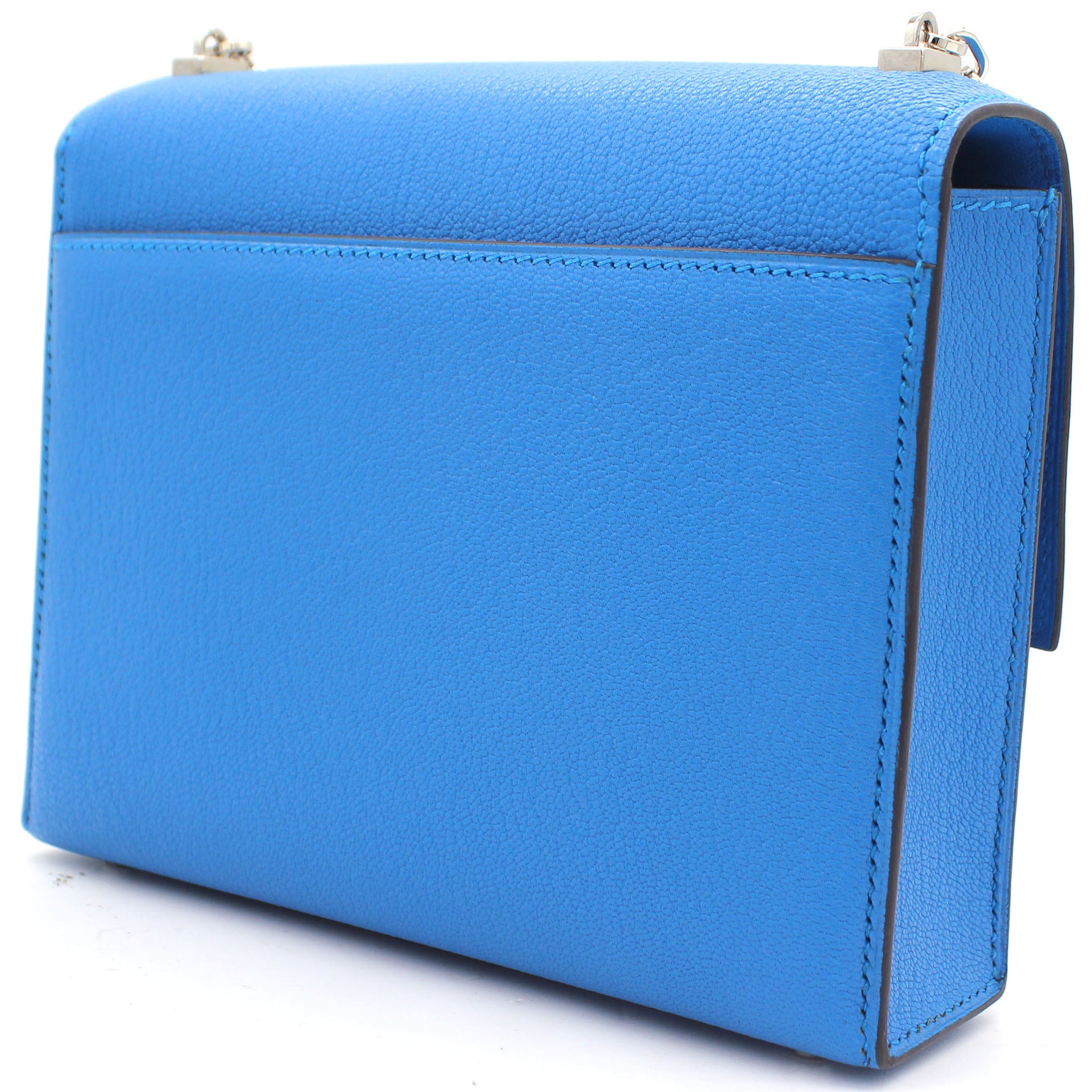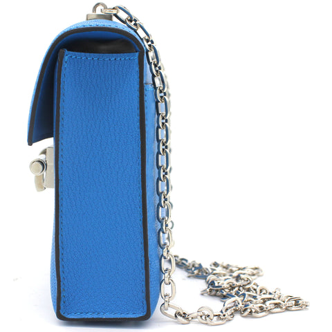 | This stunning shoulder bag is beautifully crafted of goatskin leather in vibrant blue. The bag features a palladium silver link strap and a facing full flap that seals with a silver stylized latch closure. The flap opens to a leather interior with patch pockets. |