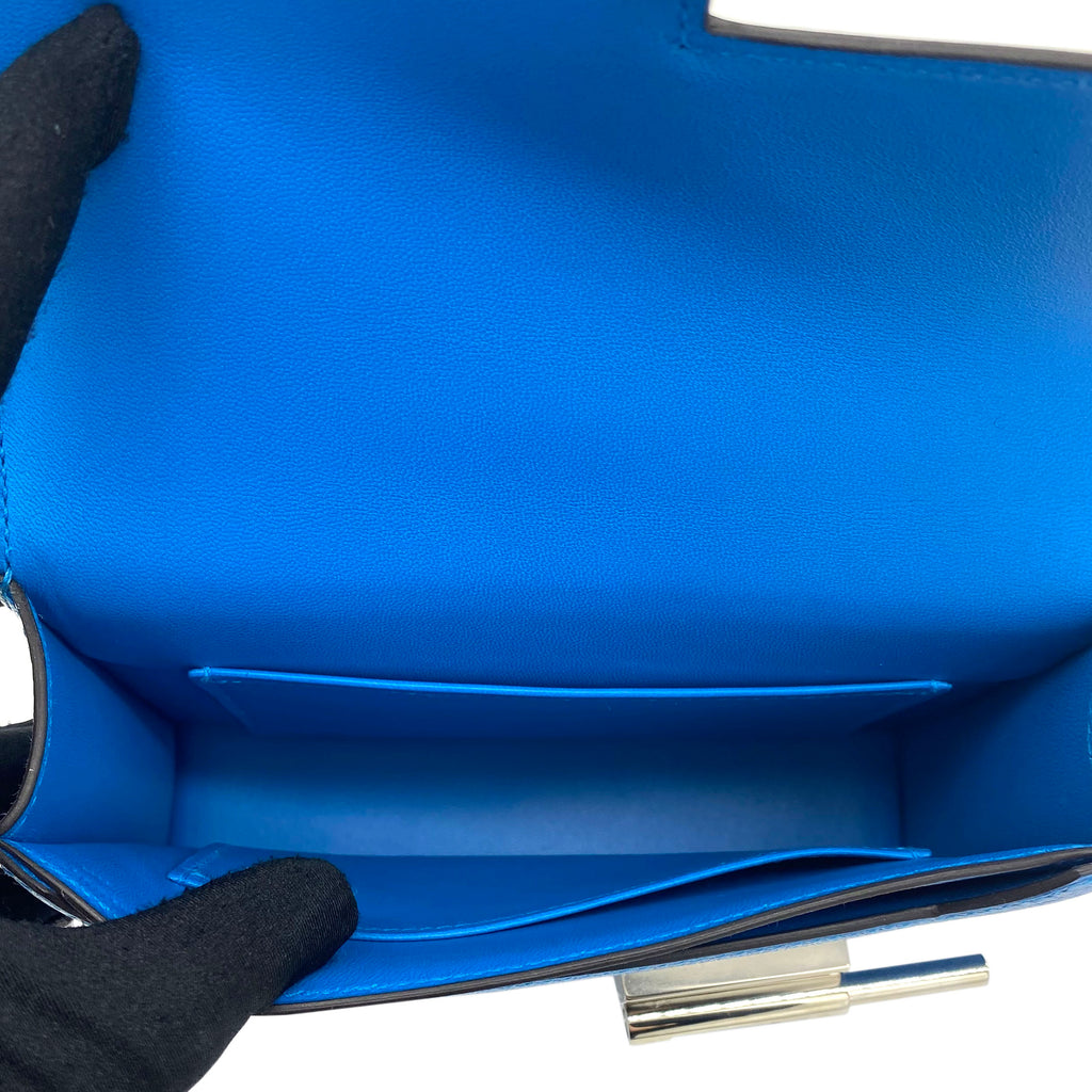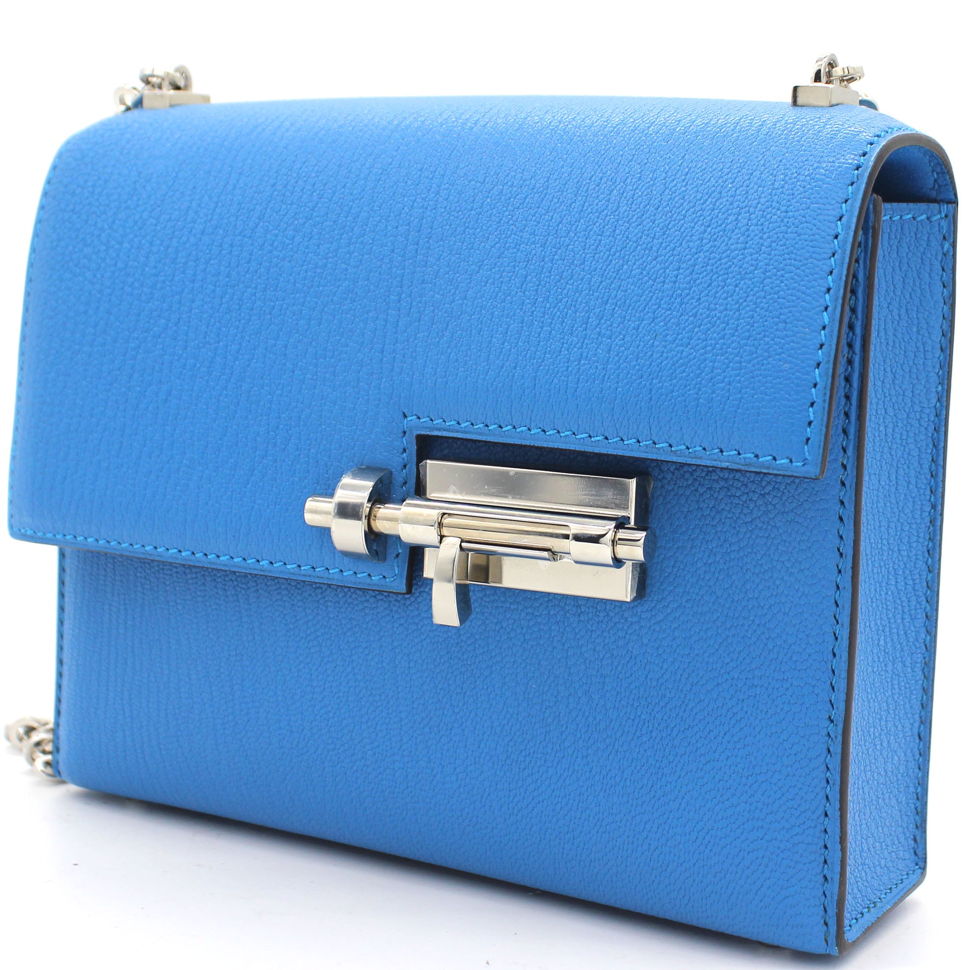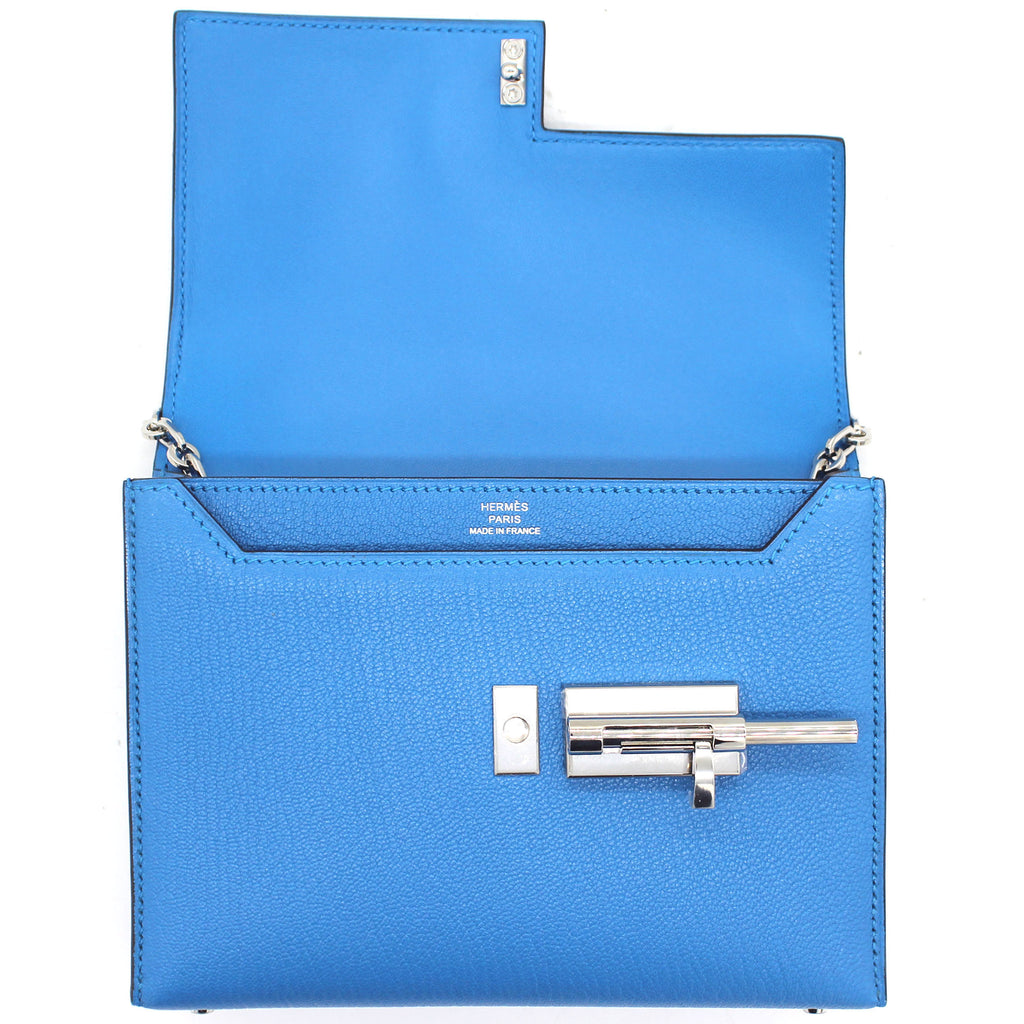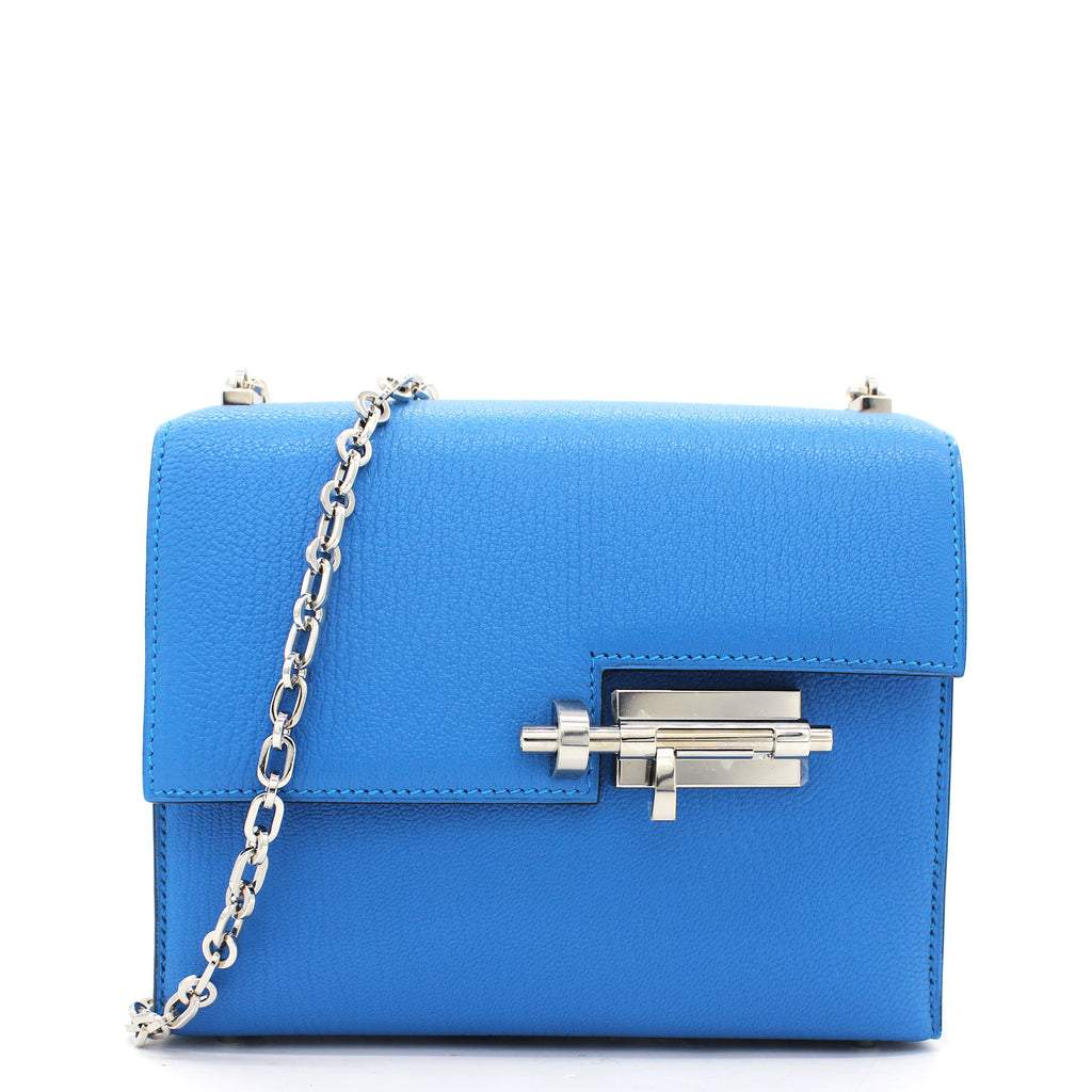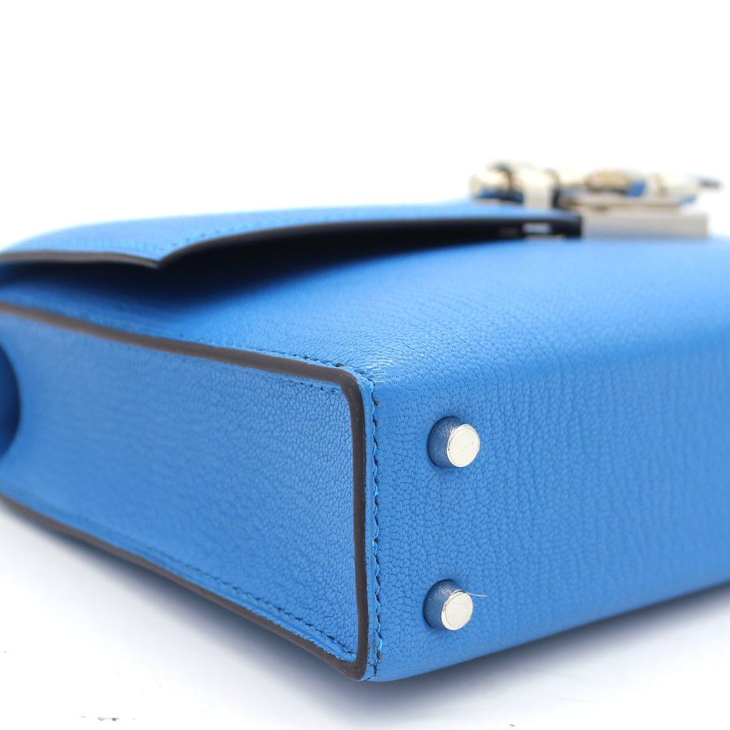 | This stunning shoulder bag is beautifully crafted of goatskin leather in vibrant blue. The bag features a palladium silver link strap and a facing full flap that seals with a silver stylized latch closure. The flap opens to a leather interior with patch pockets. |