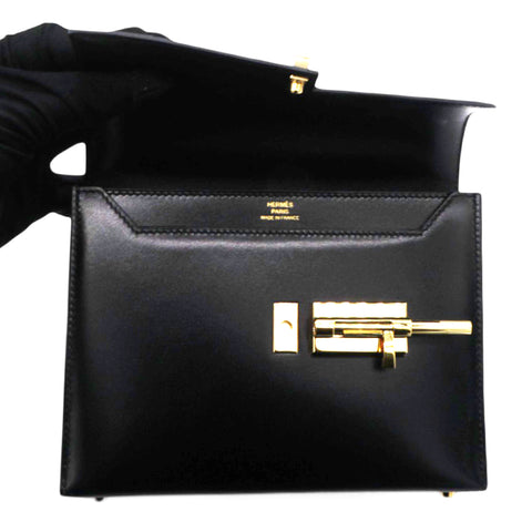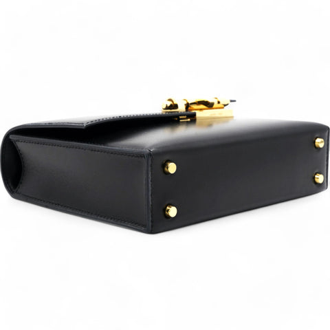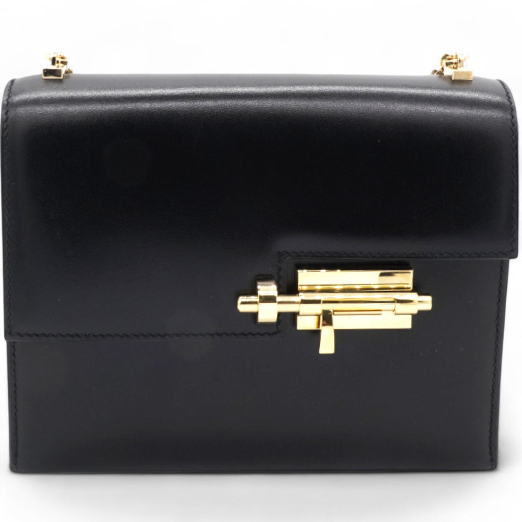 | This stunning shoulder bag is beautifully crafted of leather in black. The bag features a polished gold plated shoulder strap and a facing full flap that seals with a polished gold stylized latch closure. The flap opens to a matching leather interior with patch pockets. |