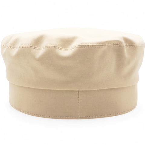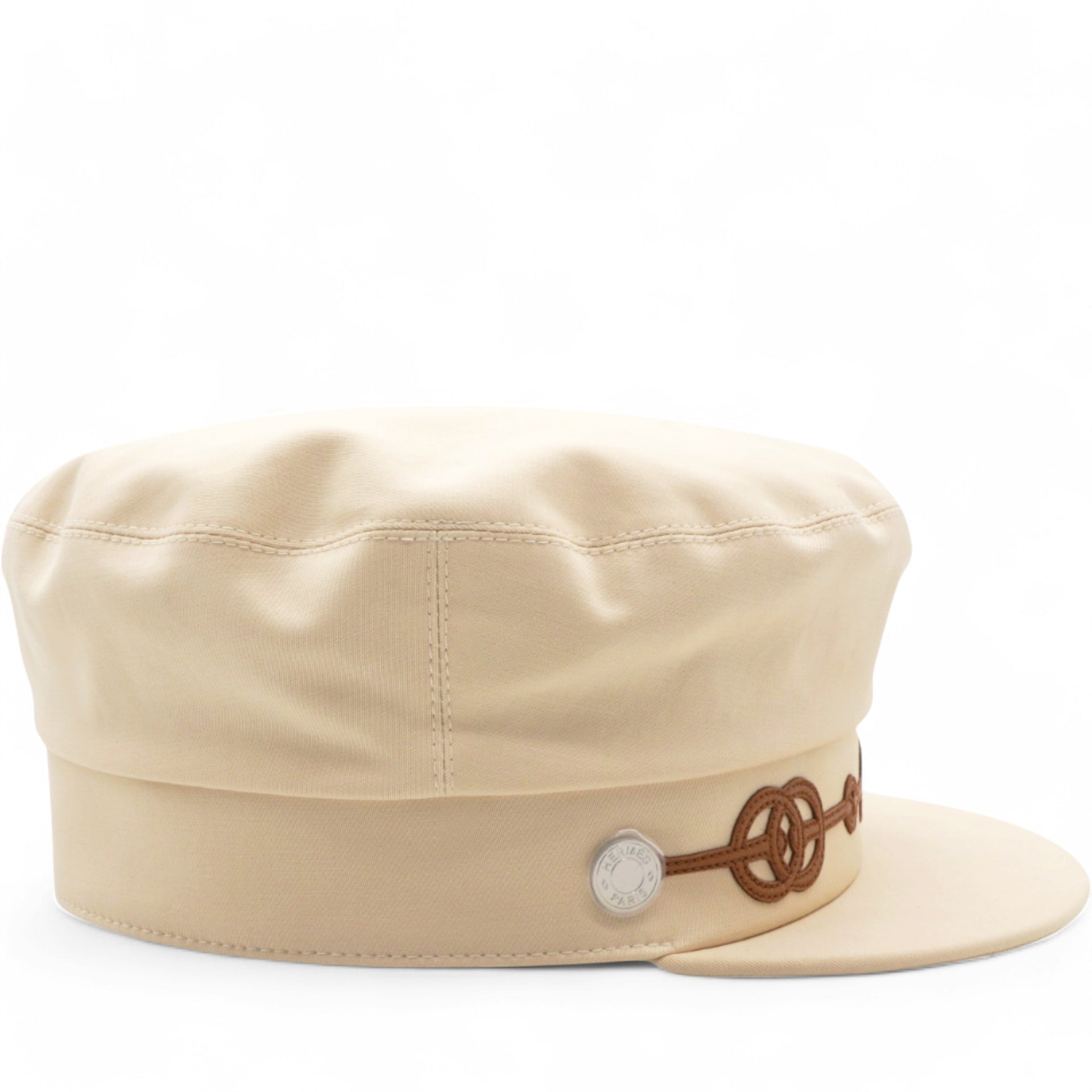 | This is an authentic HERMES Double Linen Twill Casquette Cabourg Cliquetis Cap in White Creme. This lovely hat is crafted of light beige linen with a short brim and a twill lining. |
