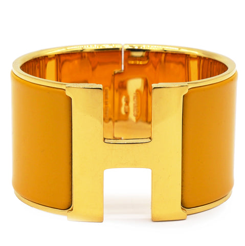 This is a chic bracelet from Hermes that is classic yet very modern. It has a wide band of plated gold with a hinge on one side and opens with a swivel Hermes "H" on the prominent side. Around the band is a strip of enameled yellow set into the gold hardware. This is a stylish bracelet for a one of a kind look from Hermes!. |