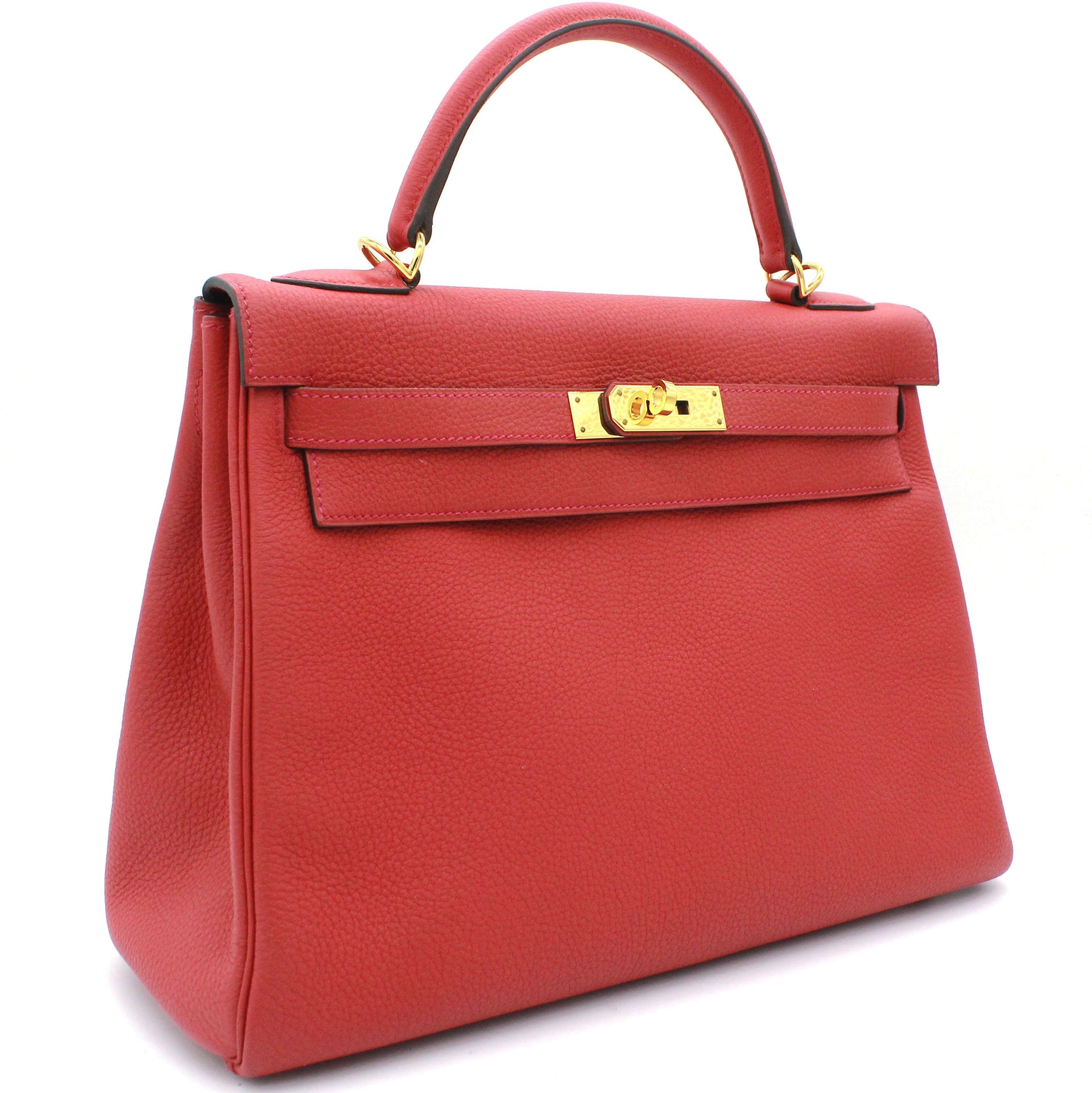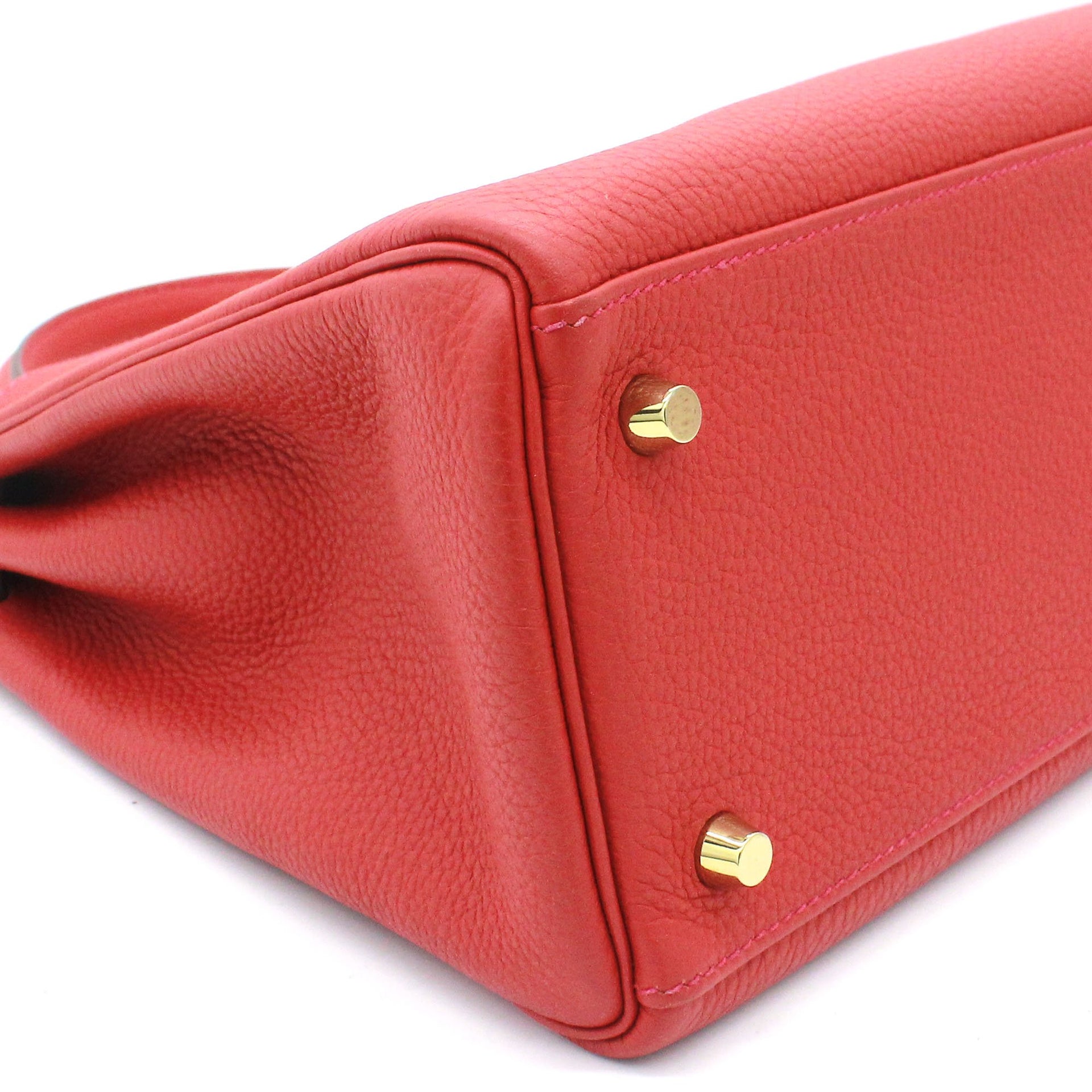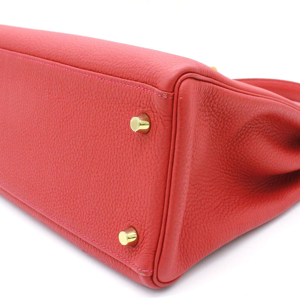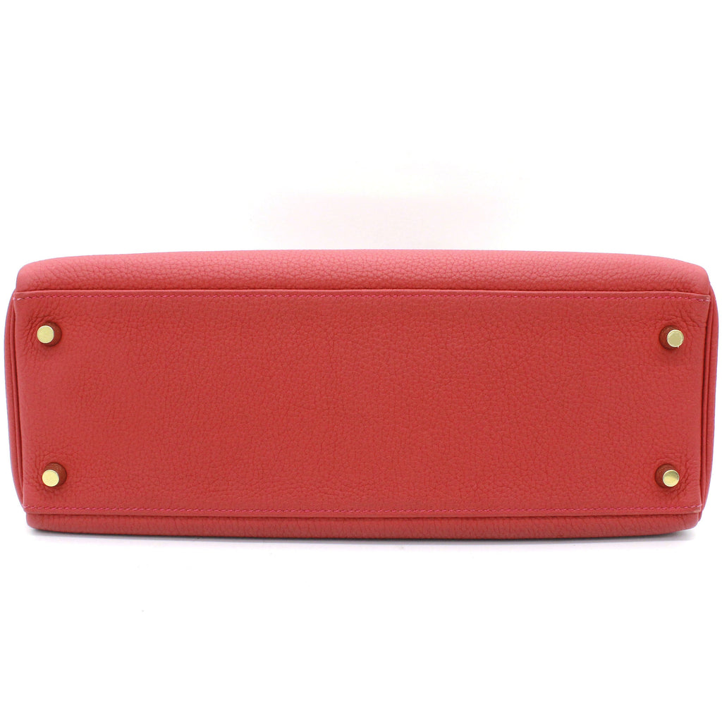 | Hermès Kelly 32 crafted in Togo leather in Géranuim and designed with hardware and tonal stitching. Interior has 1 slip pocket and 1 zip pocket. |