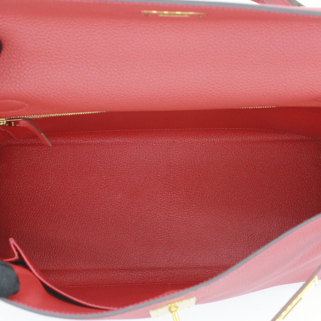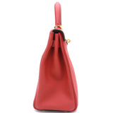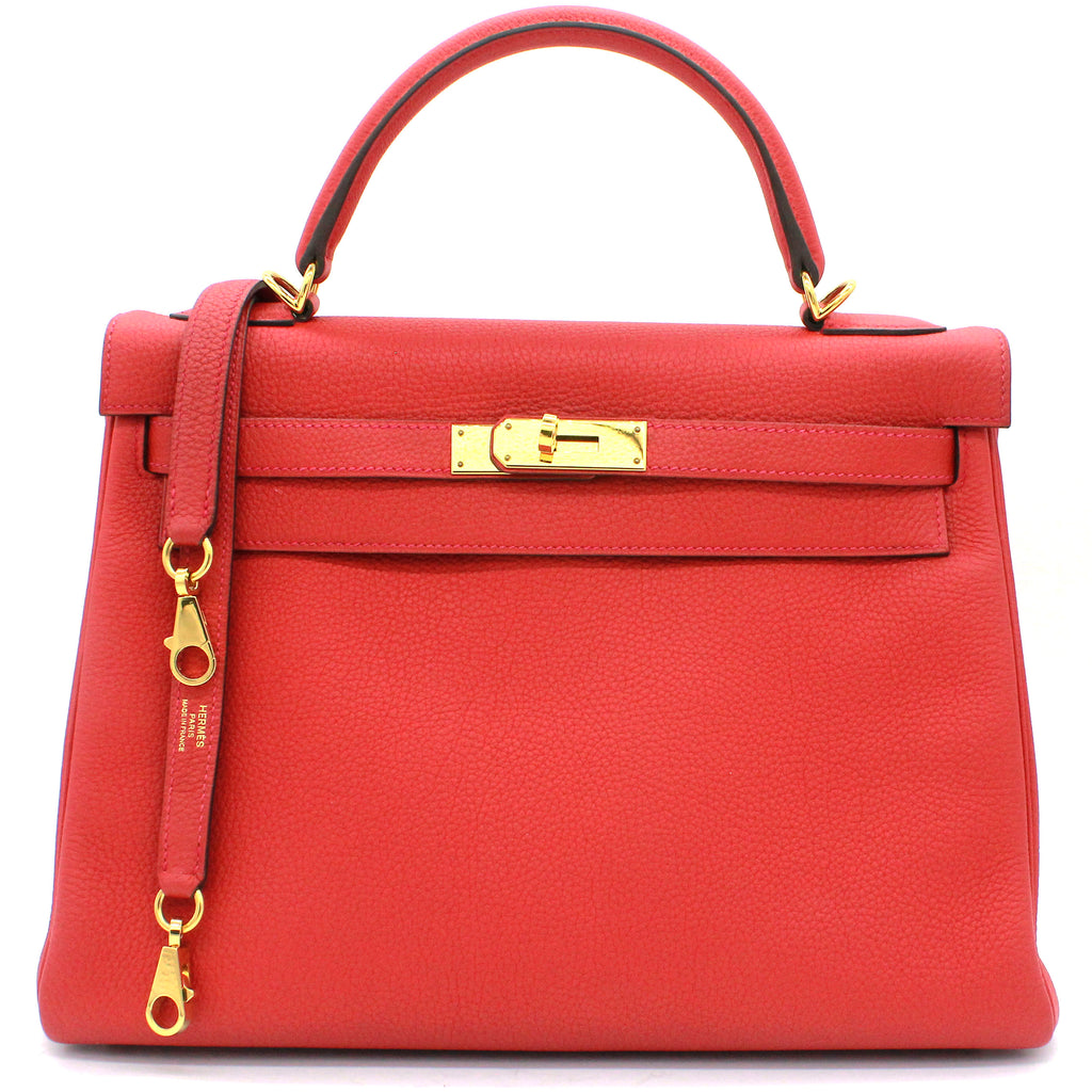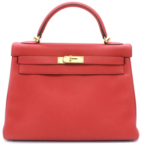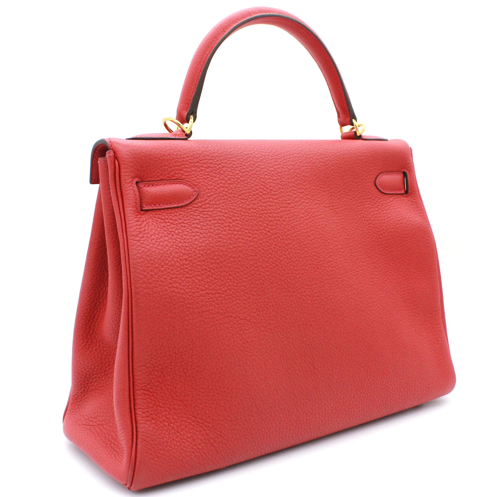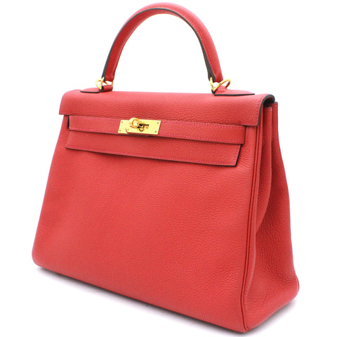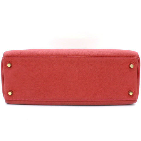 | Hermès Kelly 32 crafted in Togo leather in Géranuim and designed with hardware and tonal stitching. Interior has 1 slip pocket and 1 zip pocket. |