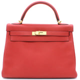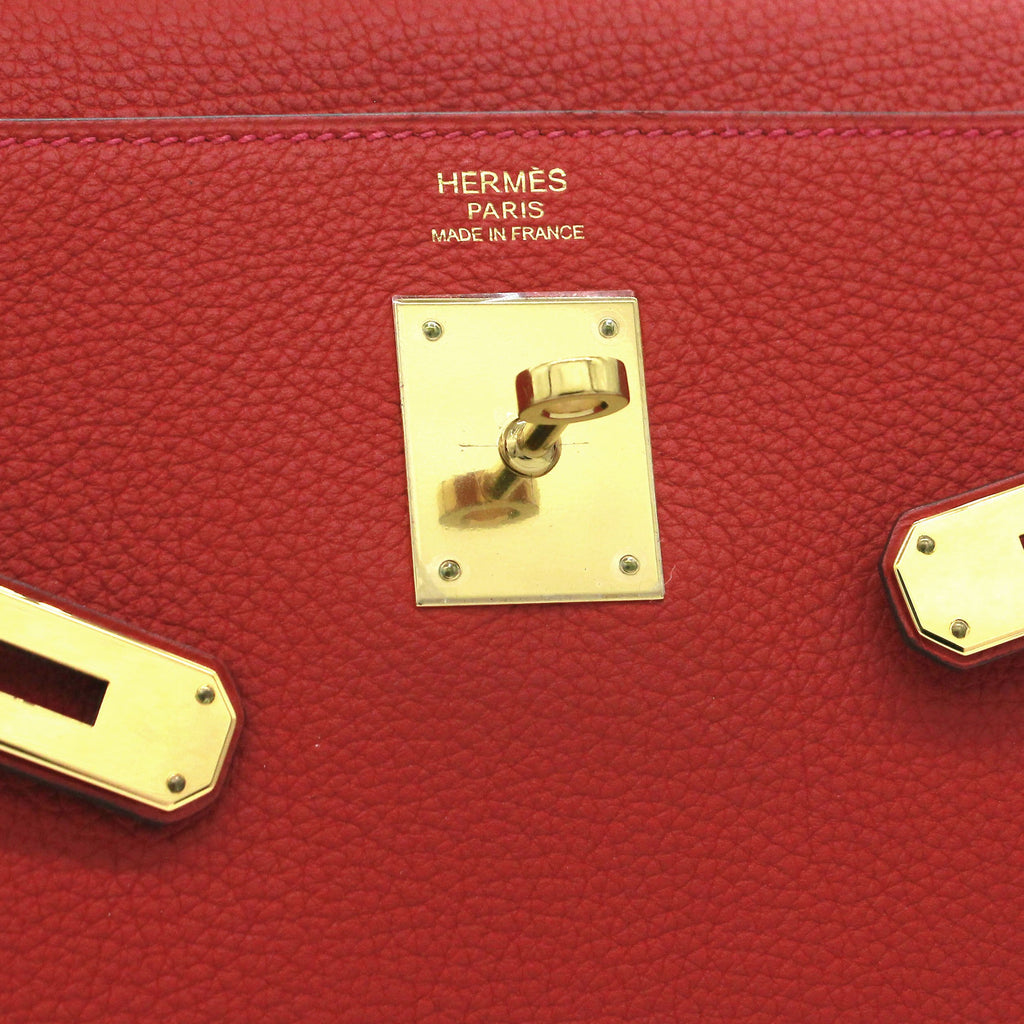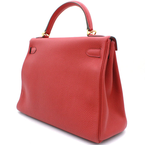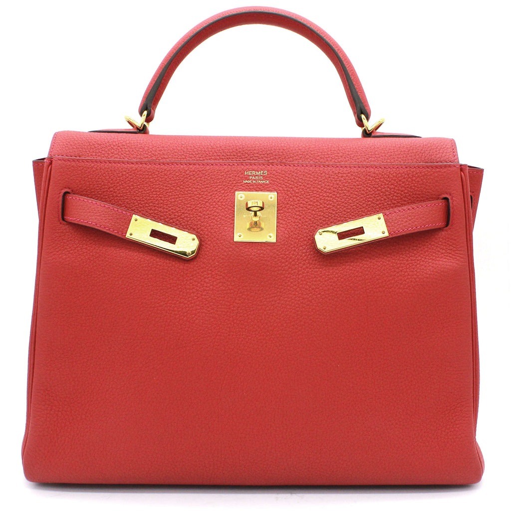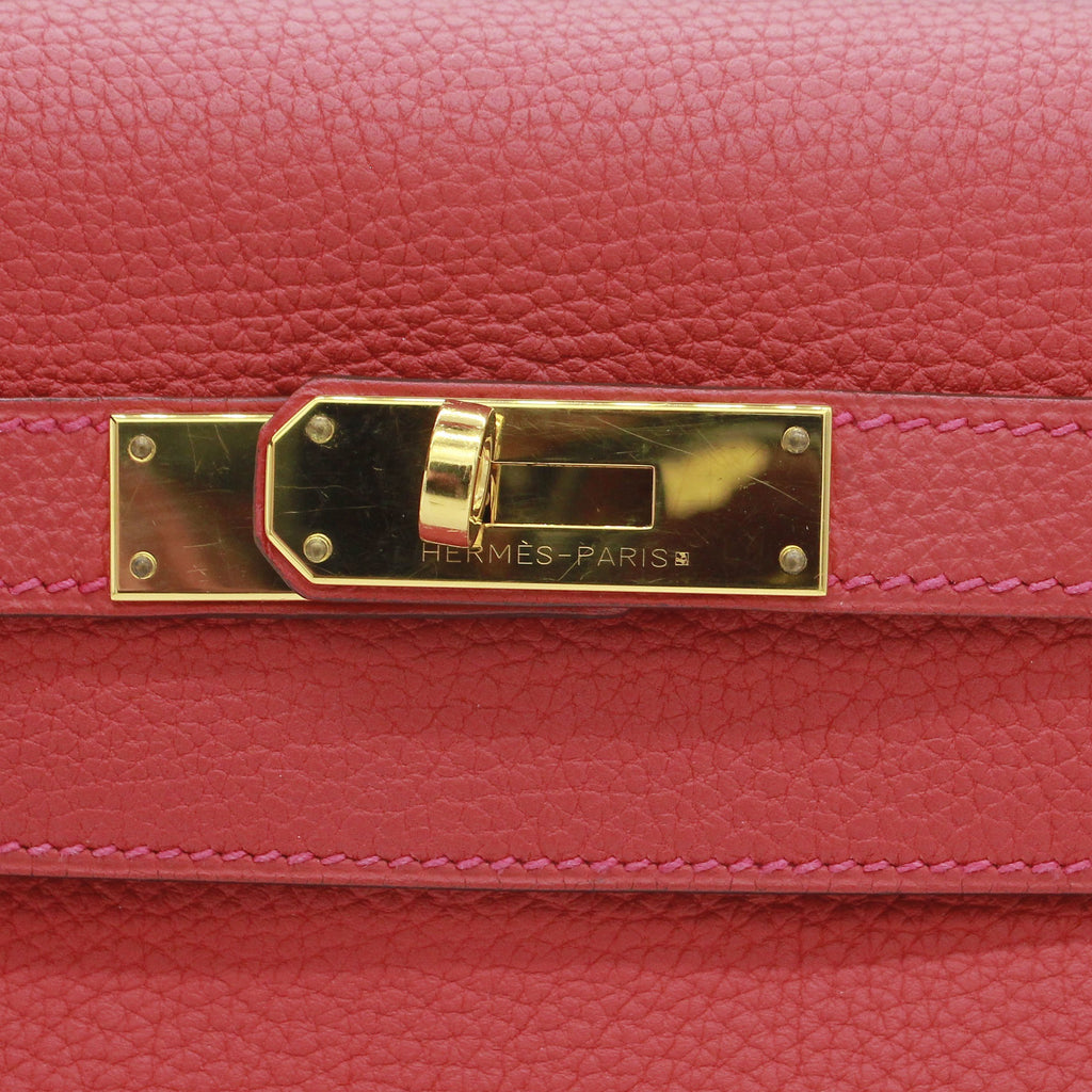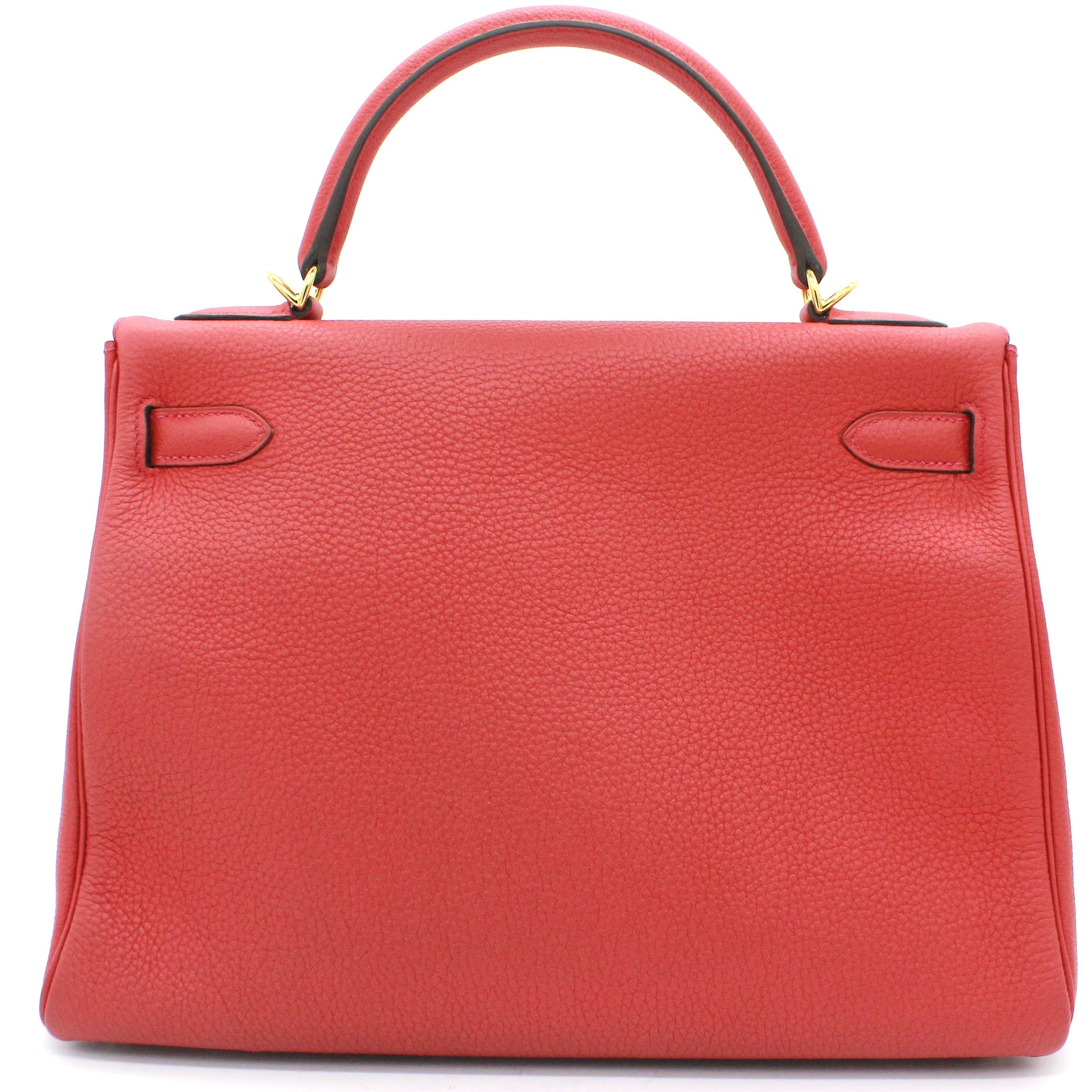 | Hermès Kelly 32 crafted in Togo leather in Géranuim and designed with hardware and tonal stitching. Interior has 1 slip pocket and 1 zip pocket. |
