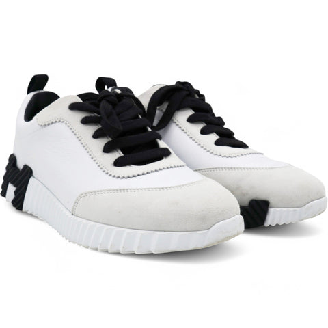 | These stylish sneakers are crafted of white leather, with matching suede leather trim. These sneakers feature black laces and white rubber soles with a black Hermes H logo. |