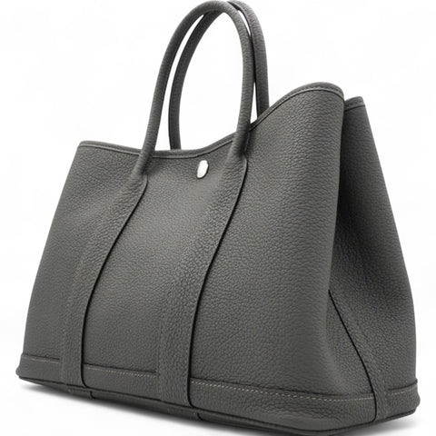 | This sophisticated tote is crafted of grained leather in gray. It features rolled leather top handles, expandable sides, and palladium hardware. The open top reveals a herringbone fabric interior with a zip pocket. |