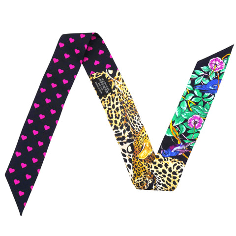 | The bold design and exceptional quality of this Hermes bandeau makes it a fabulous fashion accessory. This scarf features a cheetah and jungle design on a black background. |