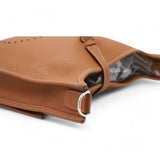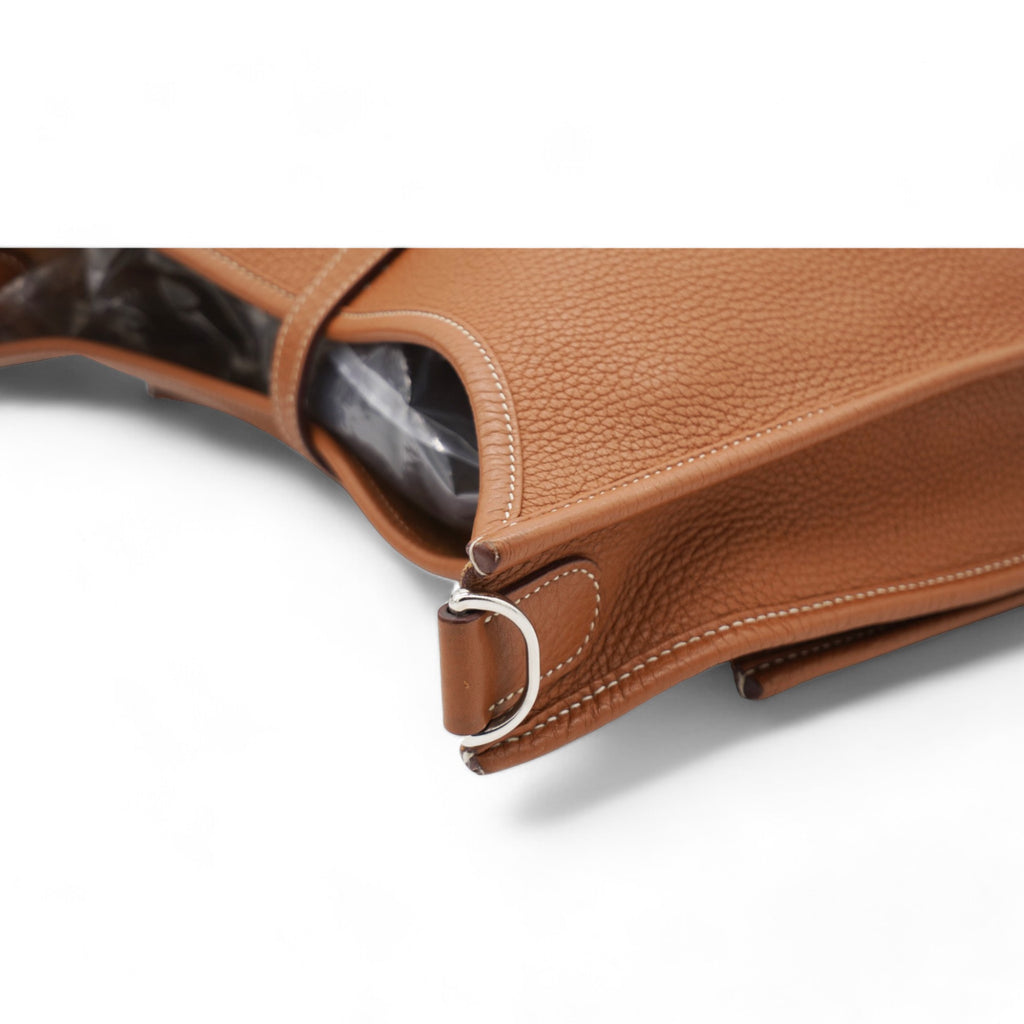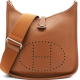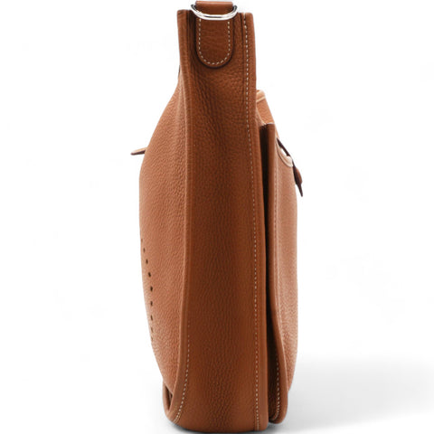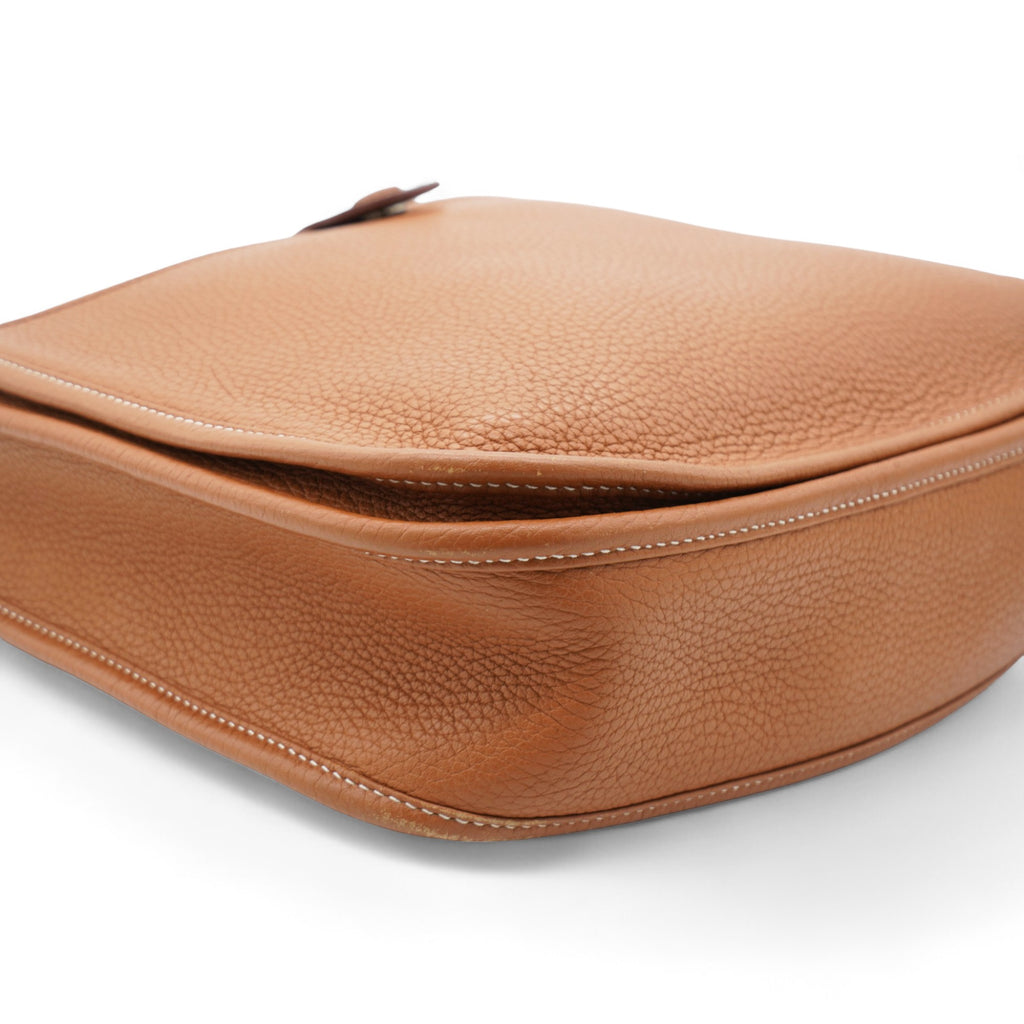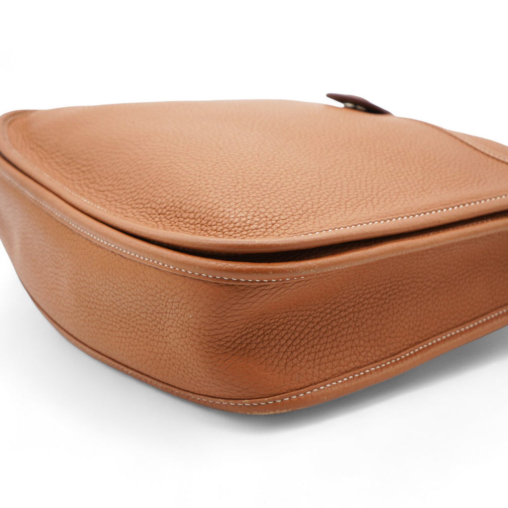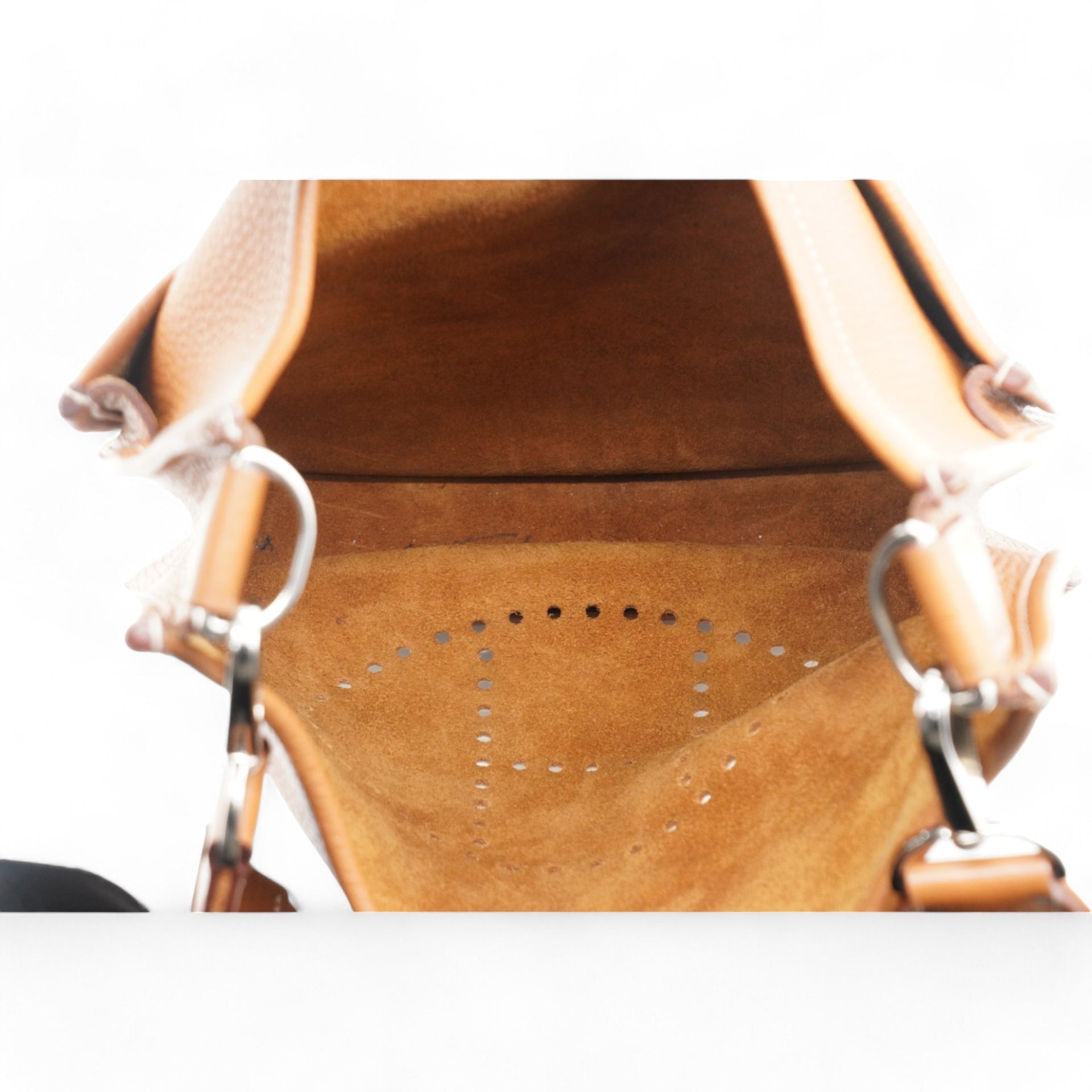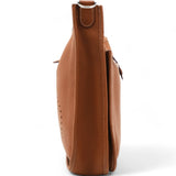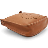 | This stylish messenger bag is crafted of fine Taurillon Clemence calfskin leather in brown. It features an adjustable matching canvas shoulder strap, a rear pocket, and a perforated Hermes H oval on the front of the bag. The top of the bag opens with a cross over strap to a matching suede interior. |