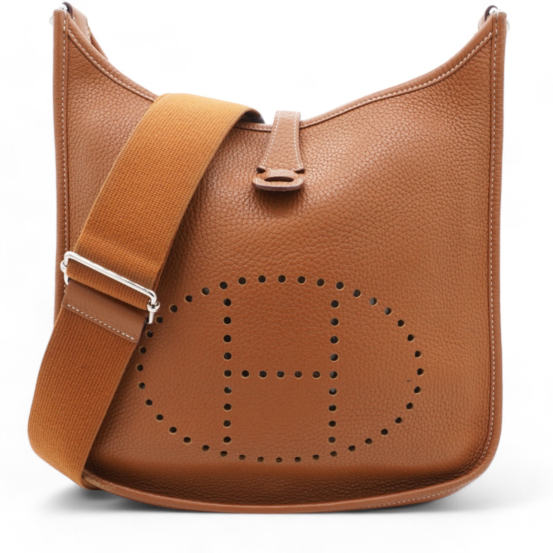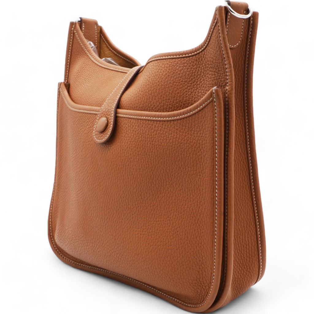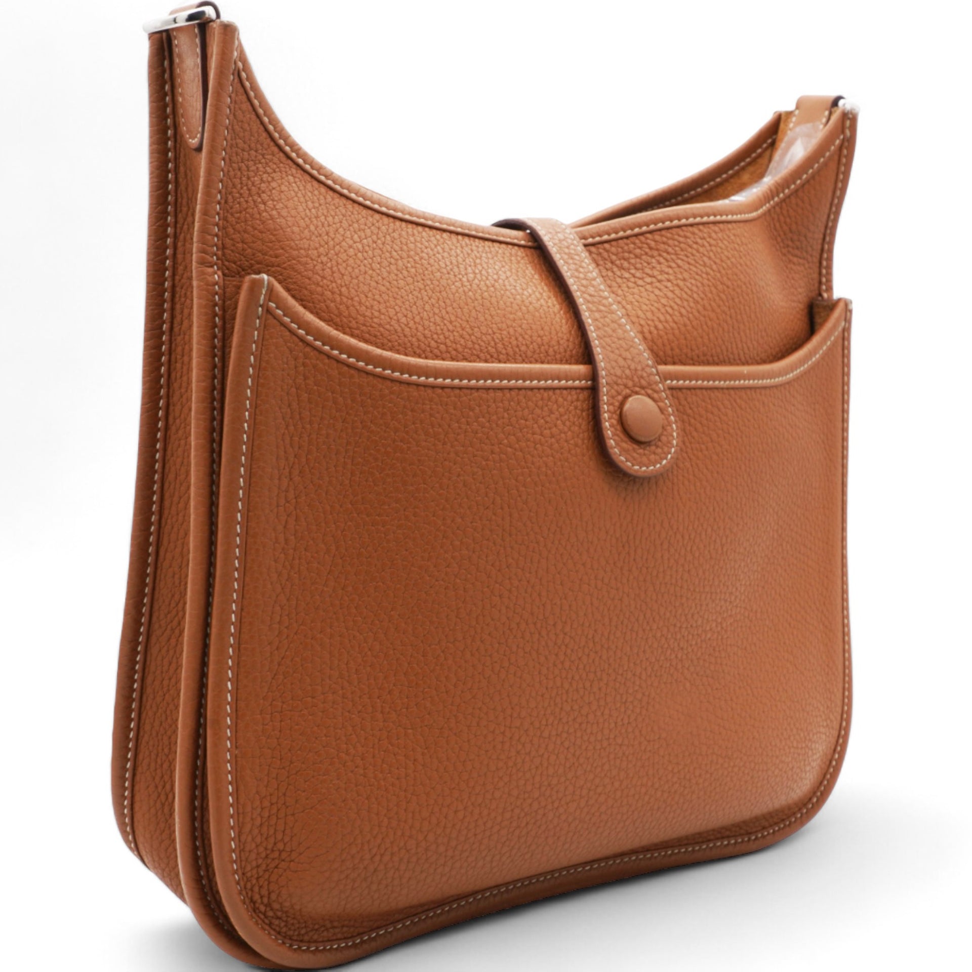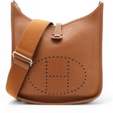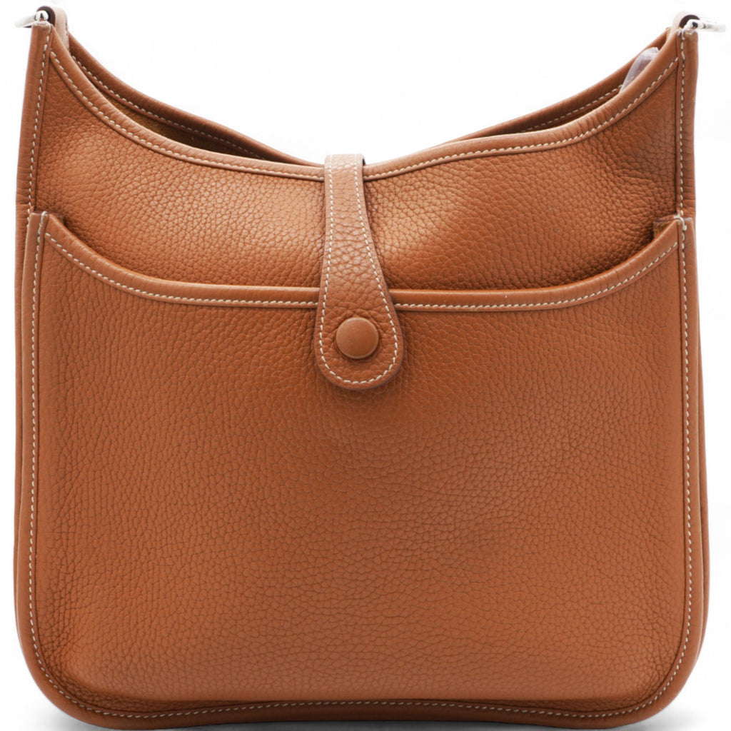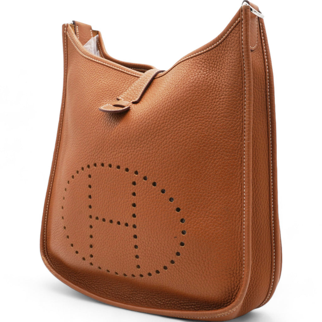 | This stylish messenger bag is crafted of fine Taurillon Clemence calfskin leather in brown. It features an adjustable matching canvas shoulder strap, a rear pocket, and a perforated Hermes H oval on the front of the bag. The top of the bag opens with a cross over strap to a matching suede interior. |