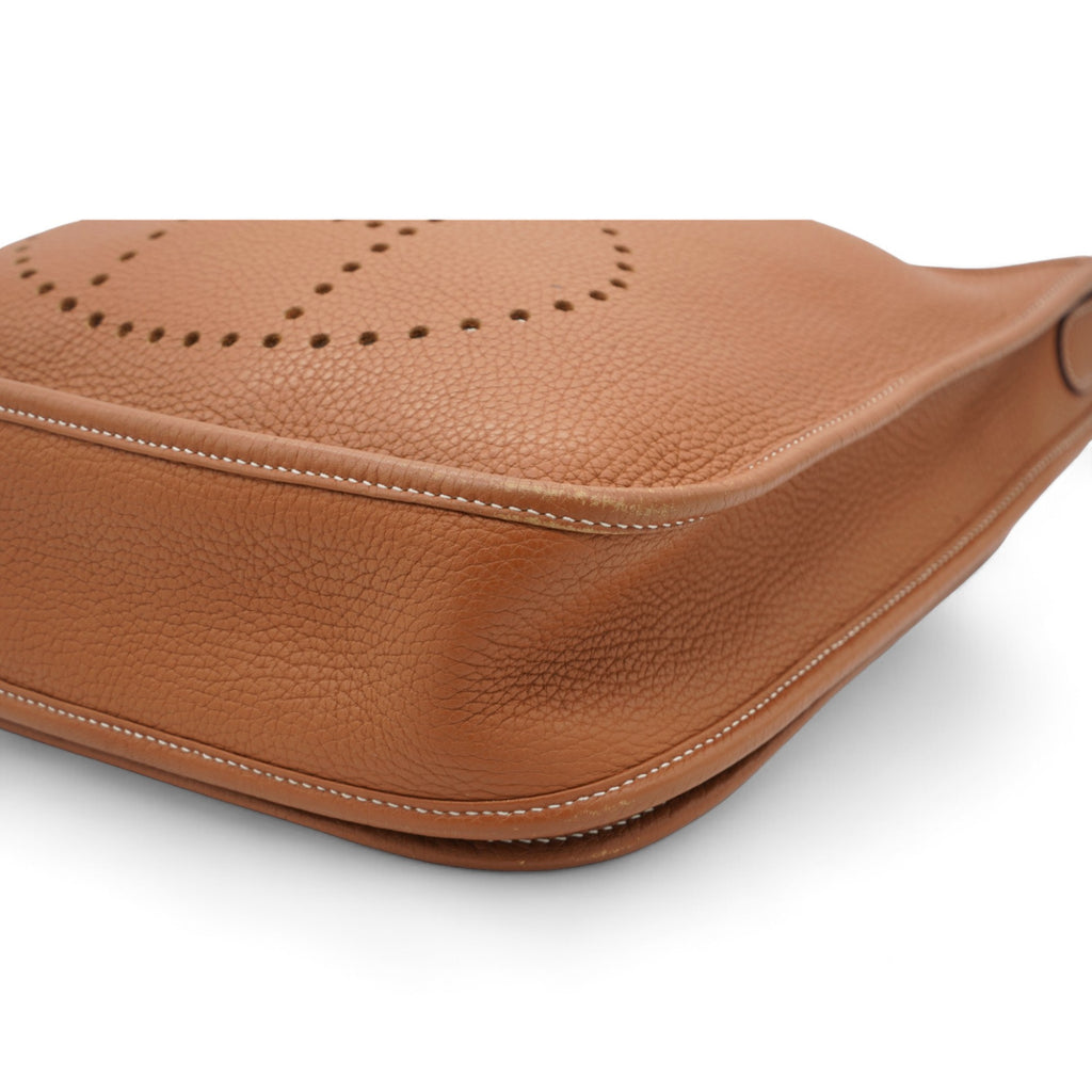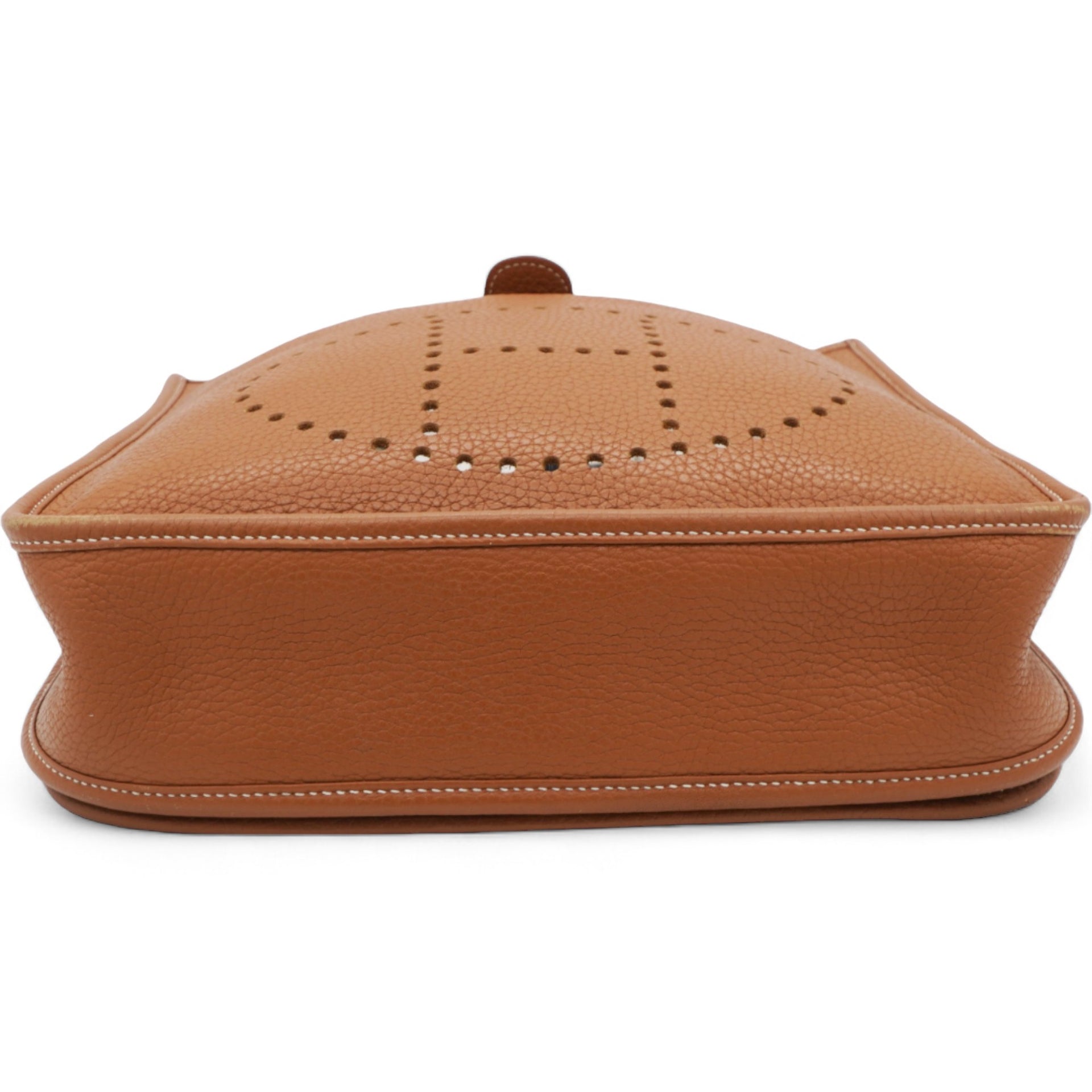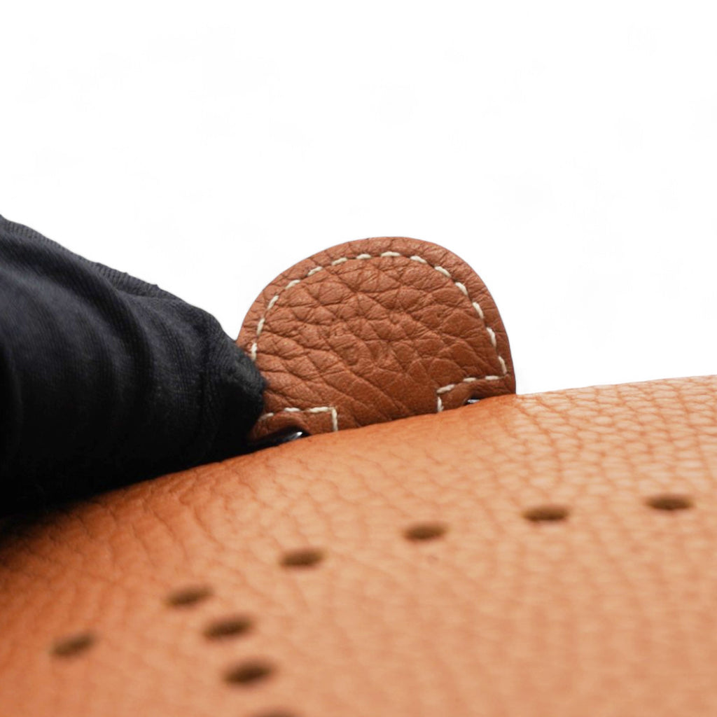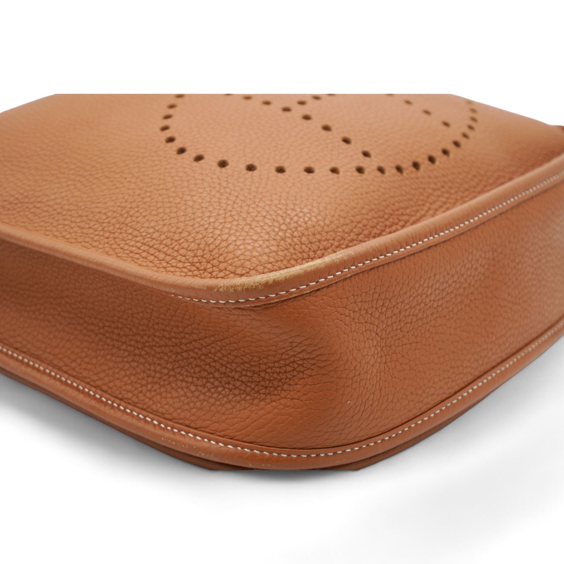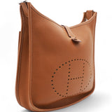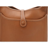 | This stylish messenger bag is crafted of fine Taurillon Clemence calfskin leather in brown. It features an adjustable matching canvas shoulder strap, a rear pocket, and a perforated Hermes H oval on the front of the bag. The top of the bag opens with a cross over strap to a matching suede interior. |