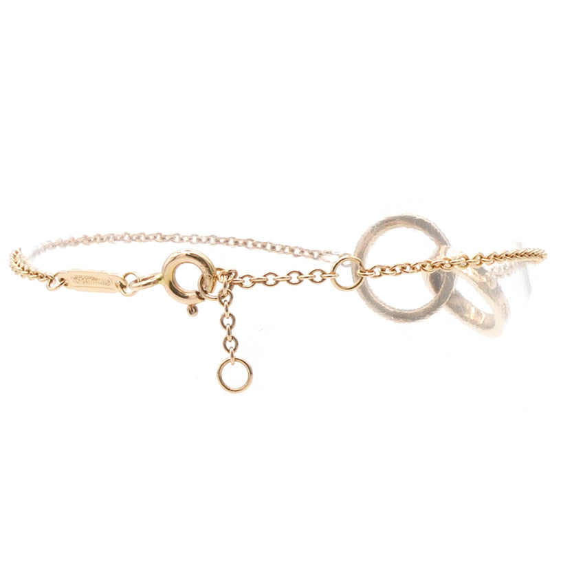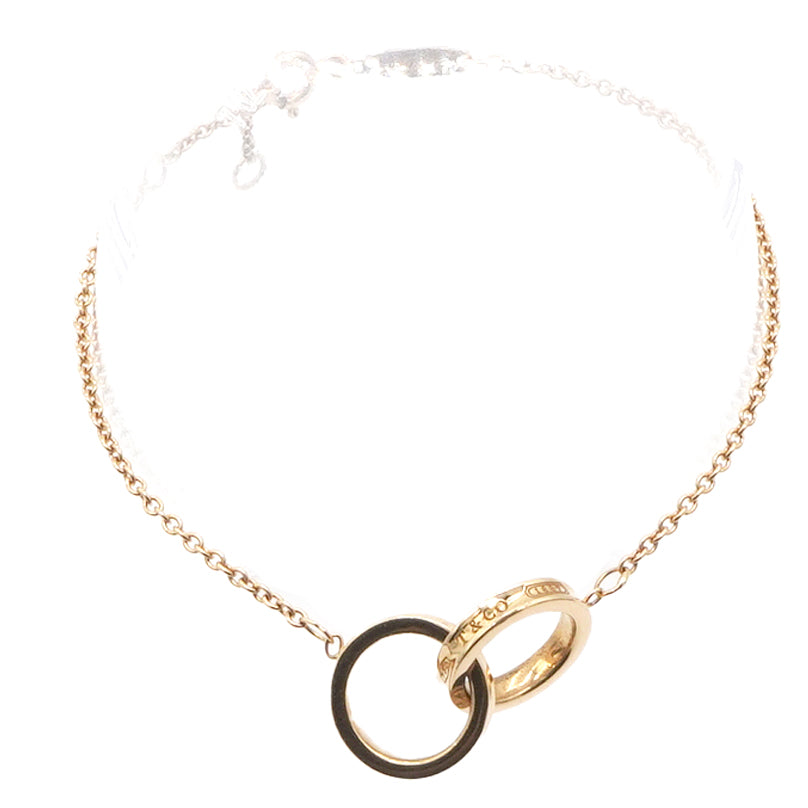 | Meticulously made from 18k rose gold, this Tiffany & Co. bracelet is minimal and versatile to use. It has two interlocking circular rings that are inscribed with 1837. The rings are held by a delicate chain with a spring-ring clasp. The piece has a simple yet contemporary design and will surely lift your spirits every time you wear it. |