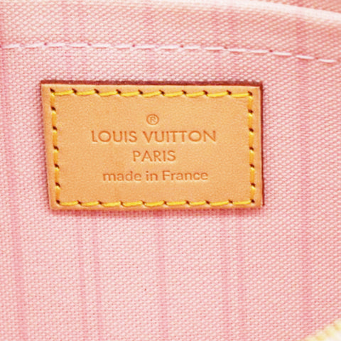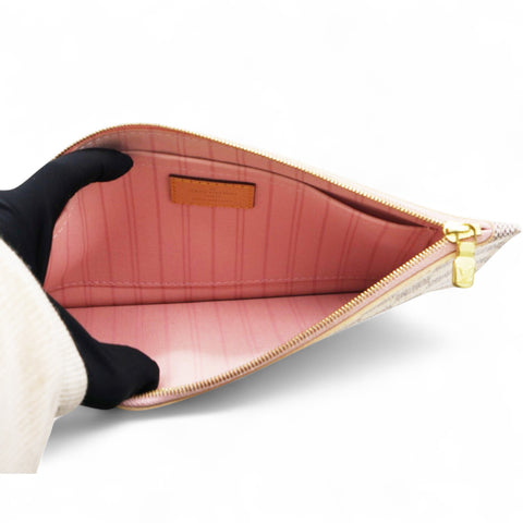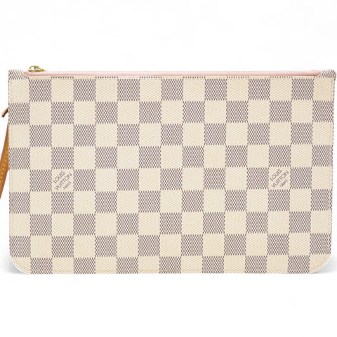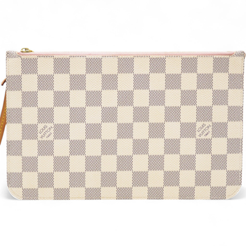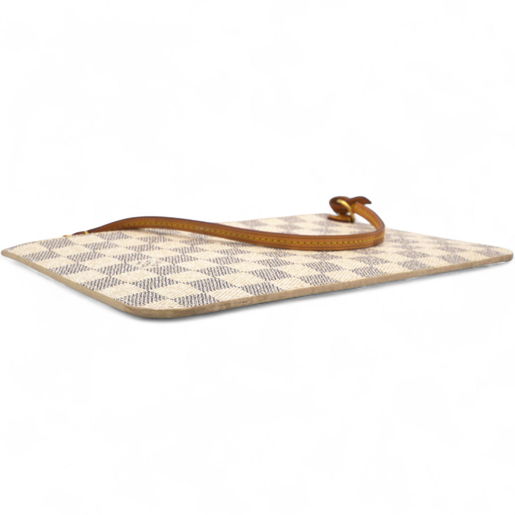 | This pouch is crafted of signature Louis Vuitton azur check canvas complimented with a vachetta leather cowhide strap for convenience. The top zipper opens to a light pink striped fabric interior with a flat pocket. This is an ideal case for everyday essentials, cosmetics and accessories, or as a wristlet or chic clutch, with the luxury and style from Louis Vuitton. |