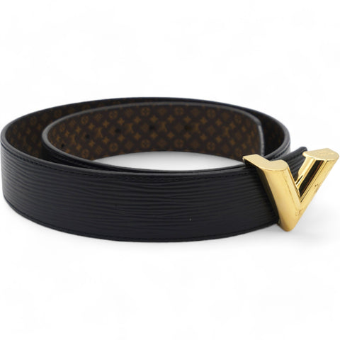 | This chic belt is crafted of Louis Vuitton's signature textured epi leather in black. This belt features a gold LV buckle. |